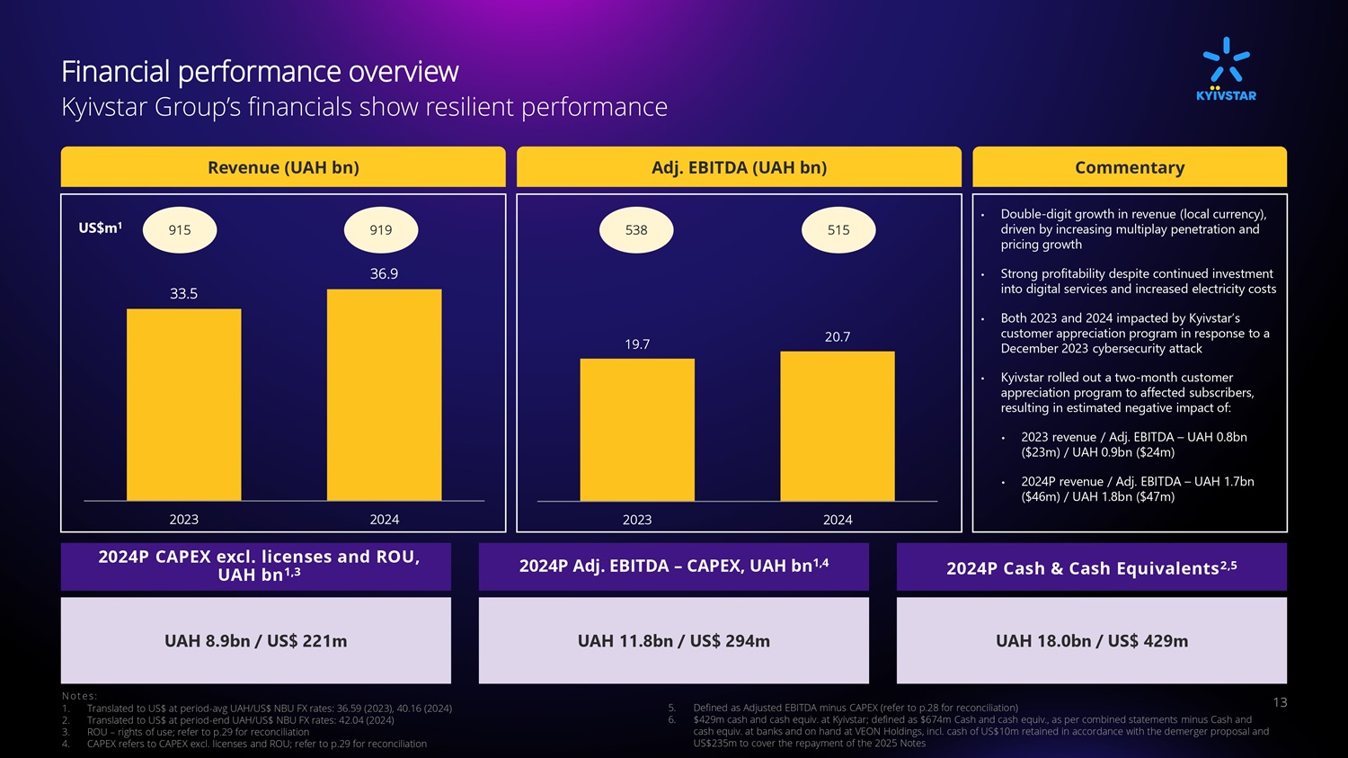 Leveraging our loyal subscriber base with digital products and services 12 Strong growth with low customer acquisition costs Big Data & AdTech platform 2.0 m mobile & fixed users 6.2 m app MAU 1 0.1 m B2B end users (licenses) 0.9 m apps MAU 1 Real - time kinematic 2 , Cybersecurity, IoT platform, Digital marketplace 2.4 m app + web MAU 1 ~70 m SMS per month sent through ADWISOR platform 2. Services provided by Kyivstar for selected industries based on high precision navigation Areas of future strategic interests and identified potential market opportunity Source: VEON, Kyivstar, management estimates Notes: 1. MAU – Monthly active users