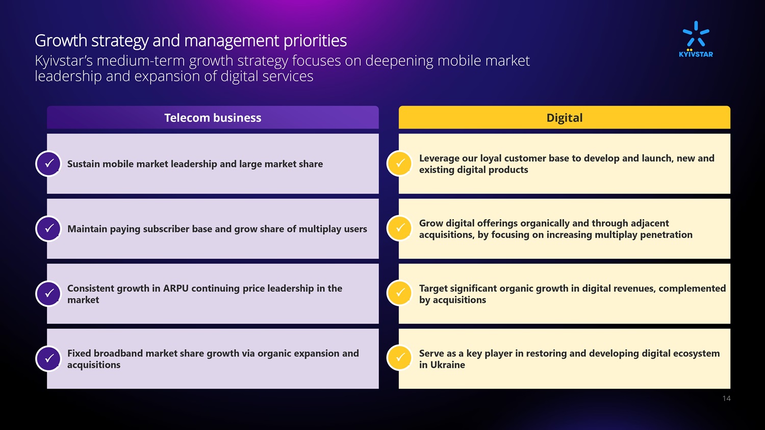 19.7 20.7 2023 2024 33.5 2023 2024 13 Financial performance overview Kyivstar Group’s financials show resilient performance N o te s : 1. Translated to US$ at period - avg UAH/US$ NBU FX rates: 36.59 (2023), 40.16 (2024) 2. Translated to US$ at period - end UAH/US$ NBU FX rates: 42.04 (2024) 3. ROU – rights of use; refer to p.29 for reconciliation 4. CAPEX refers to CAPEX excl. licenses and ROU; refer to p.29 for reconciliation 5. Defined as Adjusted EBITDA minus CAPEX (refer to p.28 for reconciliation) 6. $429m cash and cash equiv. at Kyivstar; defined as $674m Cash and cash equiv., as per combined statements minus Cash and cash equiv. at banks and on hand at VEON Holdings, incl. cash of US$10m retained in accordance with the demerger proposal and US$235m to cover the repayment of the 2025 Notes UAH 18.0bn / US$ 429m UAH 11.8bn / US$ 294m UAH 8.9bn / US$ 221m 515 538 US$m 1 • Double - digit growth in revenue (local currency), driven by increasing multiplay penetration and pricing growth • Strong profitability despite continued investment into digital services and increased electricity costs • Both 2023 and 2024 impacted by Kyivstar’s customer appreciation program in response to a December 2023 cybersecurity attack • Kyivstar rolled out a two - month customer appreciation program to affected subscribers, resulting in estimated negative impact of: • 2023 revenue / Adj. EBITDA – UAH 0.8bn ($23m) / UAH 0.9bn ($24m) • 2024P revenue / Adj. EBITDA – UAH 1.7bn ($46m) / UAH 1.8bn ($47m) 919 36.9 915 2024P Adj. EBITDA – CAPEX, UAH bn 1,4 2024P CAPEX excl. licenses and ROU, UAH bn 1,3 2024P Cash & Cash Equivalents 2,5 Revenue (UAH bn) Adj. EBITDA (UAH bn) Commentary