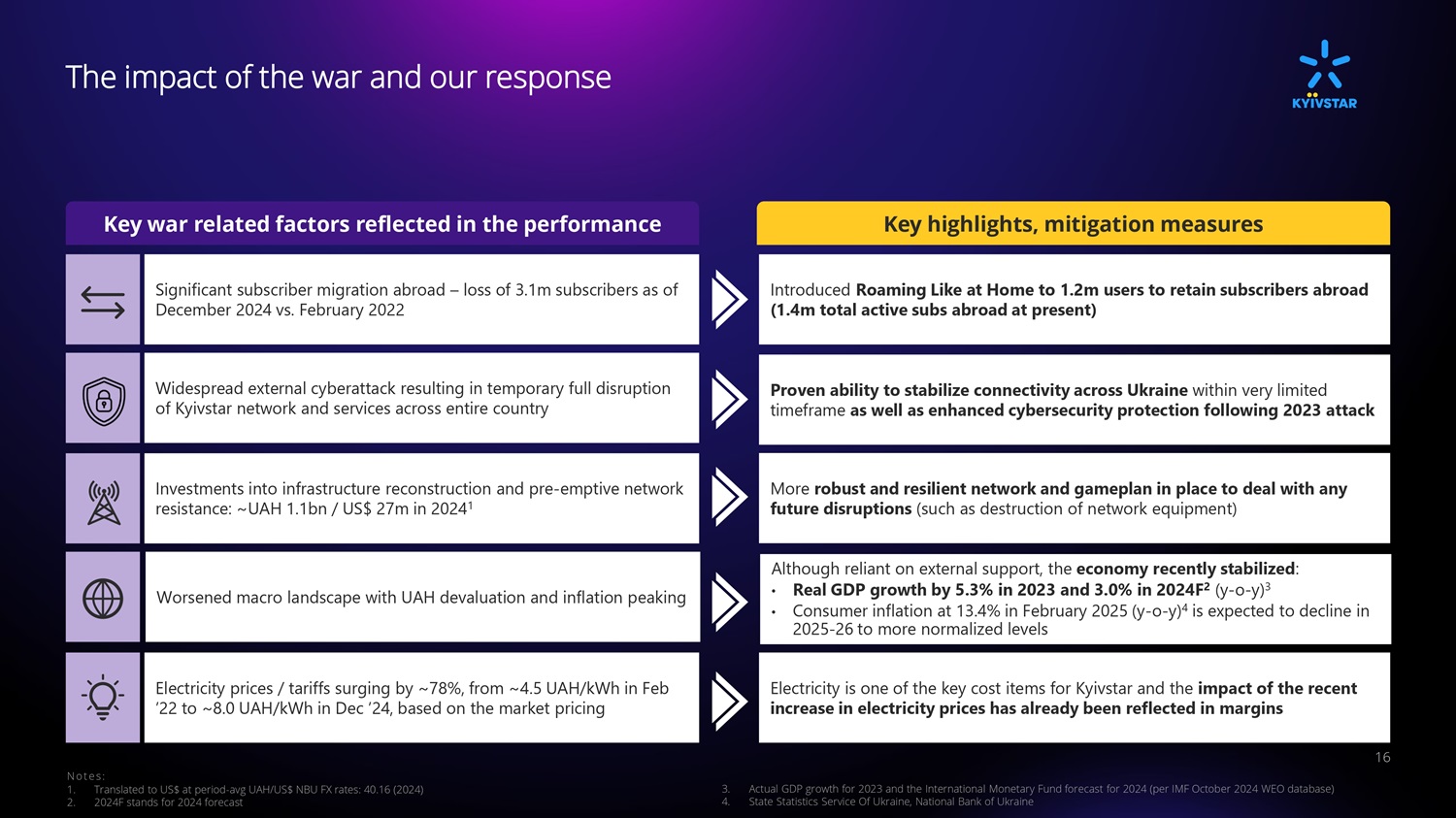 15 Invest in Kyivstar – Invest in Ukraine Kyivstar is a major social sponsor, investor and top - rated employer in Ukraine 1 Kyivstar committed to invest US$ 1bn in Ukraine from 2023 - 2027 1 Roaming and Interconnect Development of roaming and international interconnect businesses generating cash in hard currency M&A pipeline Driving digital revenue ramp - up via acquisitions and build - out of ecosystem around Kyivstar Spectrum frequencies Participation in spectrum auctions with an aim to provide better service Core business Network development, resilience, technological leadership, digitalization, and development of existing business lines Multiple initiatives to improve quality of life in Ukraine 2 Support State & Society Employee Support Support for Business ᴣ ᴣ ᴣ N o te s : 1. According to quarterly reputation tracking report prepared by marketing agency InMind, Forbes