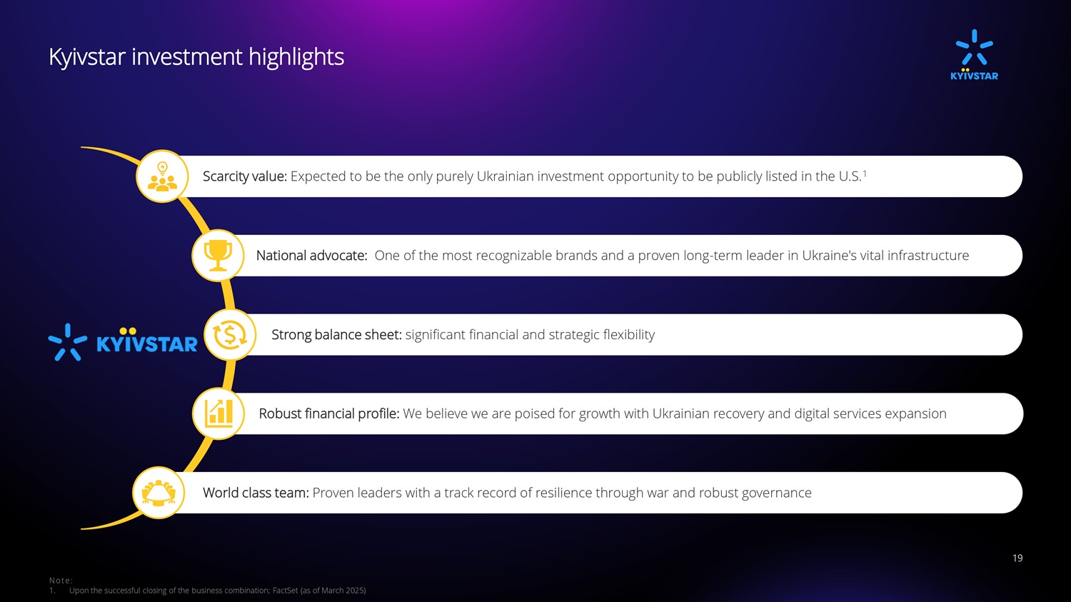 Kyivstar investment highlights World class team: Proven leaders with a track record of resilience through war and robust governance Robust financial profile: We believe we are poised for growth with Ukrainian recovery and digital services expansion Strong balance sheet: significant financial and strategic flexibility Scarcity value: Expected to be the only purely Ukrainian investment opportunity to be publicly listed in the U.S. 1 National advocate: One of the most recognizable brands and a proven long - term leader in Ukraine's vital infrastructure 19 N o te : 1. Upon the successful closing of the business combination; FactSet (as of March 2025)