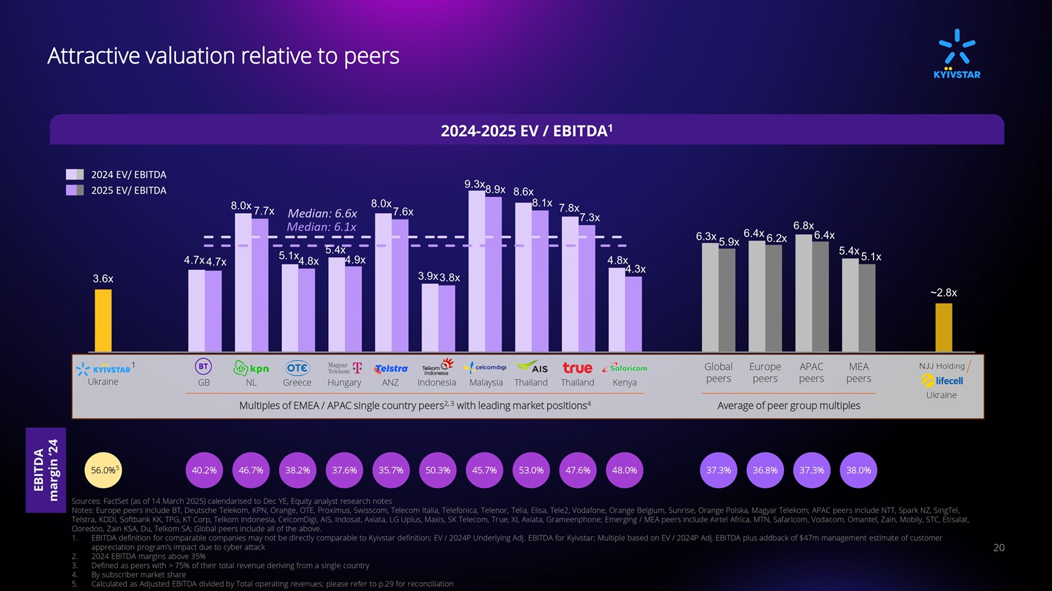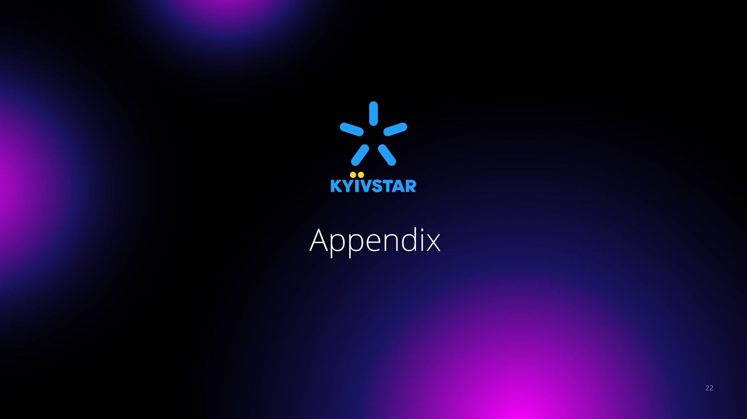 3.6x 5.1x 5.4x 4.8x 6.3x 6.4x ~2.8x 4.7x 4.7x 8.0x 7.7x 4.8x 4.9x 8.0x 7.6x 3.9x 3.8x 9.3x 8.9x 8.6x 8.1x 7.8x 7.3x 4.3x 5.9x 6.2x 6.8x 6.4x 5.4x 5.1x Attractive valuation relative to peers 20 2024 - 2025 EV / EBITDA 1 Sources: FactSet (as of 14 March 2025) calendarised to Dec YE, Equity analyst research notes Notes: Europe peers include BT, Deutsche Telekom, KPN, Orange, OTE, Proximus, Swisscom, Telecom Italia, Telefonica, Telenor, Telia, Elisa, Tele2, Vodafone, Orange Belgium, Sunrise, Orange Polska, Magyar Telekom; APAC peers include NTT, Spark NZ, SingTel, Telstra, KDDI, Softbank KK, TPG, KT Corp, Telkom Indonesia, CelcomDigi, AIS, Indosat, Axiata, LG Uplus, Maxis, SK Telecom, True, XL Axiata, Grameenphone; Emerging / MEA peers include Airtel Africa, MTN, Safaricom, Vodacom, Omantel, Zain, Mobily, STC, Etisalat, Ooredoo, Zain KSA, Du, Telkom SA; Global peers include all of the above. 1. EBITDA definition for comparable companies may not be directly comparable to Kyivstar definition; EV / 2024P Underlying Adj. EBITDA for Kyivstar; Multiple based on EV / 2024P Adj. EBITDA plus addback of $47m management estimate of customer appreciation program’s impact due to cyber attack 2. 2024 EBITDA margins above 35% 3. Defined as peers with > 75% of their total revenue deriving from a single country 4. By subscriber market share 5. Calculated as Adjusted EBITDA divided by Total operating revenues; please refer to p.29 for reconciliation 1 Ukraine Global Europe APAC peers peers peers MEA peers Kenya Ukraine GB EBITDA margin ‘24 37.3% 40.2% 46.7% 48.0% 38.2% 37.6% 35.7% 50.3% 45.7% 53.0% 47.6% 38.0% 36.8% 37.3% Average of peer group multiples NL Greece Hungary ANZ Indonesia Malaysia Thailand Thailand Multiples of EMEA / APAC single country peers 2, 3 with leading market positions 4 Median: 6.6x Median: 6.1x 2024 EV/ EBITDA 2025 EV/ EBITDA 56.0% 5