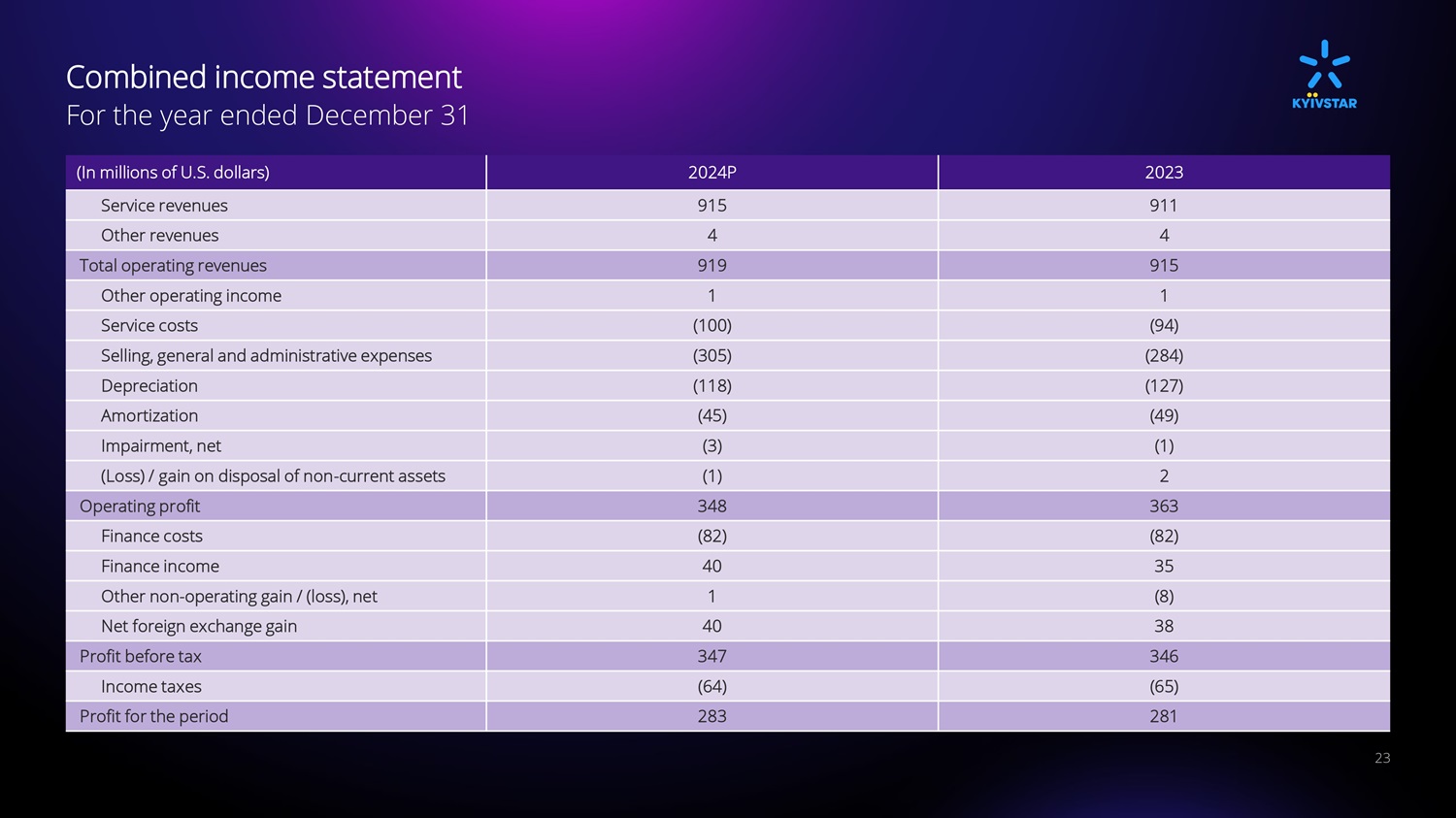 23 Combined income statement For the year ended December 31 2023 2024P (In millions of U.S. dollars) 911 915 Service revenues 4 4 Other revenues 915 919 Total operating revenues 1 1 Other operating income (94) (100) Service costs (284) (305) Selling, general and administrative expenses (127) (118) Depreciation (49) (45) Amortization (1) (3) Impairment, net 2 (1) (Loss) / gain on disposal of non - current assets 363 348 Operating profit (82) (82) Finance costs 35 40 Finance income (8) 1 Other non - operating gain / (loss), net 38 40 Net foreign exchange gain 346 347 Profit before tax (65) (64) Income taxes 281 283 Profit for the period
