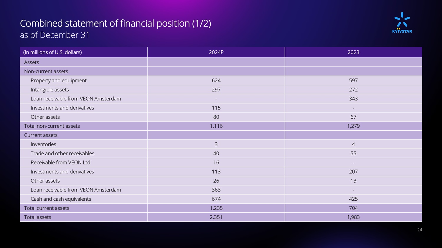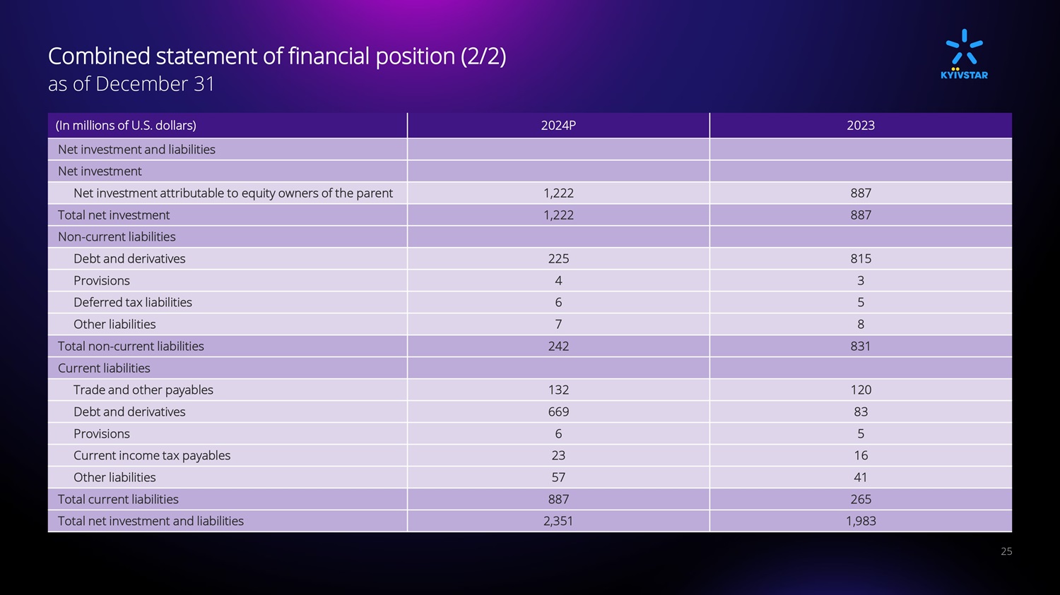 24 Combined statement of financial position (1/2) as of December 31 2023 2024P (In millions of U.S. dollars) Assets Non - current assets 597 624 Property and equipment 272 297 Intangible assets 343 - Loan receivable from VEON Amsterdam - 115 Investments and derivatives 67 80 Other assets 1,279 1,116 Total non - current assets Current assets 4 3 Inventories 55 40 Trade and other receivables - 16 Receivable from VEON Ltd. 207 113 Investments and derivatives 13 26 Other assets - 363 Loan receivable from VEON Amsterdam 425 674 Cash and cash equivalents 704 1,235 Total current assets 1,983 2,351 Total assets