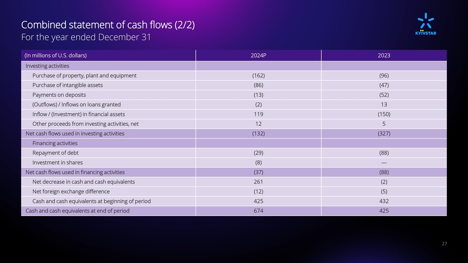 26 Combined statement of cash flows (1/2) For the year ended December 31 2023 2024P (In millions of U.S. dollars) Operating activities 346 347 Profit before tax Non - cash adjustments to reconcile profit before tax to net cash flows 177 168 Depreciation, amortization and impairment loss (2) (1) (Loss) / gain on disposal of non - current assets 82 82 Finance costs (35) (40) Finance income 8 (1) Other non - operating gain / (loss), net (38) (40) Net foreign exchange gain 28 (10) Changes in trade and other receivables and prepayments (2) — Changes in inventories (33) 32 Changes in trade and other payables 3 4 Changes in provisions, pensions and other (75) (78) Interest paid 16 19 Interest received (62) (52) Income tax paid 413 430 Net cash flows from operating activities