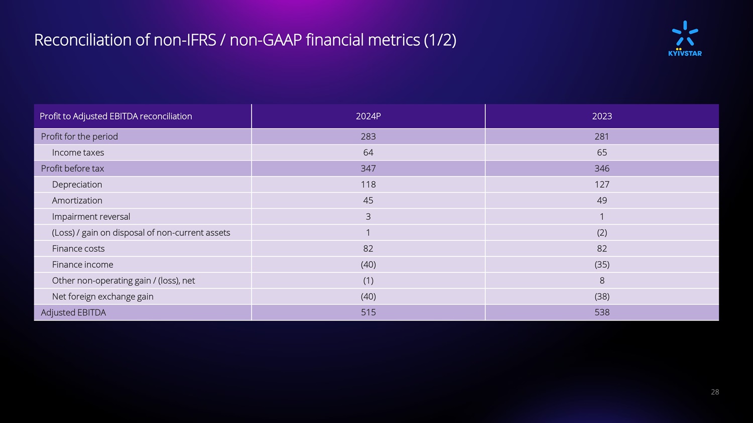 Reconciliation of non - IFRS / non - GAAP financial metrics (1/2) 28 2023 2024P Profit to Adjusted EBITDA reconciliation 281 283 Profit for the period 65 64 Income taxes 346 347 Profit before tax 127 118 Depreciation 49 45 Amortization 1 3 Impairment reversal (2) 1 (Loss) / gain on disposal of non - current assets 82 82 Finance costs (35) (40) Finance income 8 (1) Other non - operating gain / (loss), net (38) (40) Net foreign exchange gain 538 515 Adjusted EBITDA