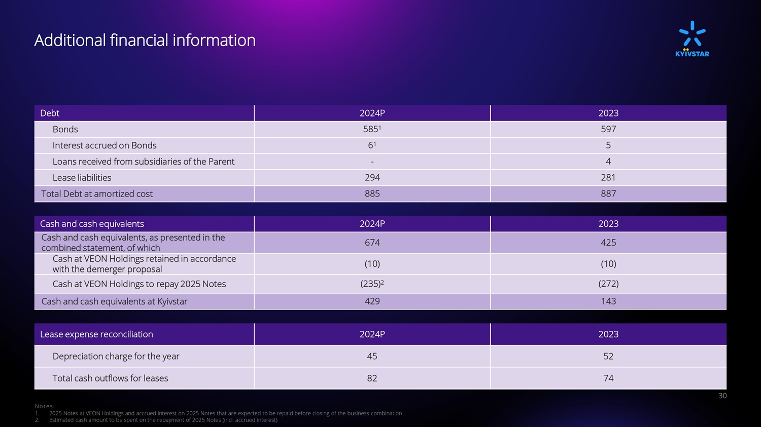 Additional financial information 30 N o te s : 1. 2025 Notes at VEON Holdings and accrued interest on 2025 Notes that are expected to be repaid before closing of the business combination 2. Estimated cash amount to be spent on the repayment of 2025 Notes (incl. accrued interest) 2023 2024P Debt 597 585 1 Bonds 5 6 1 Interest accrued on Bonds 4 - Loans received from subsidiaries of the Parent 281 294 Lease liabilities 887 885 Total Debt at amortized cost 2023 2024P Cash and cash equivalents 425 674 Cash and cash equivalents, as presented in the combined statement, of which (10) (10) Cash at VEON Holdings retained in accordance with the demerger proposal (272) (235) 2 Cash at VEON Holdings to repay 2025 Notes 143 429 Cash and cash equivalents at Kyivstar 2023 2024P Lease expense reconciliation 52 45 Depreciation charge for the year 74 82 Total cash outflows for leases