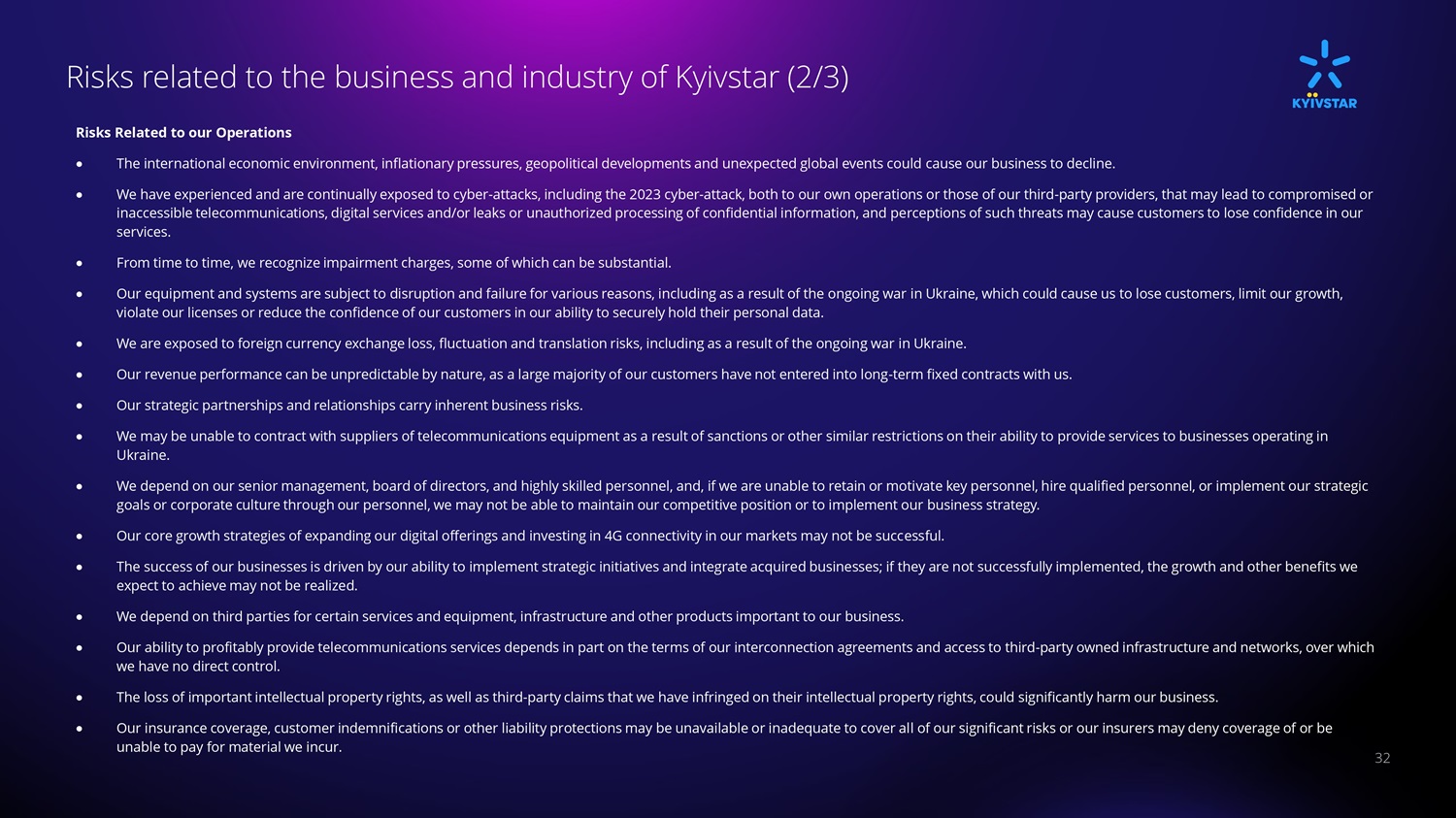 Risks related to the business and industry of Kyivstar (2/3) 32 Risks Related to our Operations                             The international economic environment, inflationary pressures, geopolitical developments and unexpected global events could cause our business to decline.   We have experienced and are continually exposed to cyber - attacks, including the 2023 cyber - attack, both to our own operations or those of our third - party providers, that may lead to compromised or inaccessible telecommunications, digital services and/or leaks or unauthorized processing of confidential information, and perceptions of such threats may cause customers to lose confidence in our services. From time to time, we recognize impairment charges, some of which can be substantial. Our equipment and systems are subject to disruption and failure for various reasons, including as a result of the ongoing war in Ukraine, which could cause us to lose customers, limit our growth, violate our licenses or reduce the confidence of our customers in our ability to securely hold their personal data. We are exposed to foreign currency exchange loss, fluctuation and translation risks, including as a result of the ongoing war in Ukraine. Our revenue performance can be unpredictable by nature, as a large majority of our customers have not entered into long - term fixed contracts with us. Our strategic partnerships and relationships carry inherent business risks. We may be unable to contract with suppliers of telecommunications equipment as a result of sanctions or other similar restrictions on their ability to provide services to businesses operating in Ukraine. We depend on our senior management, board of directors, and highly skilled personnel, and, if we are unable to retain or motivate key personnel, hire qualified personnel, or implement our strategic goals or corporate culture through our personnel, we may not be able to maintain our competitive position or to implement our business strategy. Our core growth strategies of expanding our digital offerings and investing in 4G connectivity in our markets may not be successful. The success of our businesses is driven by our ability to implement strategic initiatives and integrate acquired businesses; if they are not successfully implemented, the growth and other benefits we expect to achieve may not be realized. We depend on third parties for certain services and equipment, infrastructure and other products important to our business. Our ability to profitably provide telecommunications services depends in part on the terms of our interconnection agreements and access to third - party owned infrastructure and networks, over which we have no direct control. The loss of important intellectual property rights, as well as third - party claims that we have infringed on their intellectual property rights, could significantly harm our business. Our insurance coverage, customer indemnifications or other liability protections may be unavailable or inadequate to cover all of our significant risks or our insurers may deny coverage of or be unable to pay for material we incur.