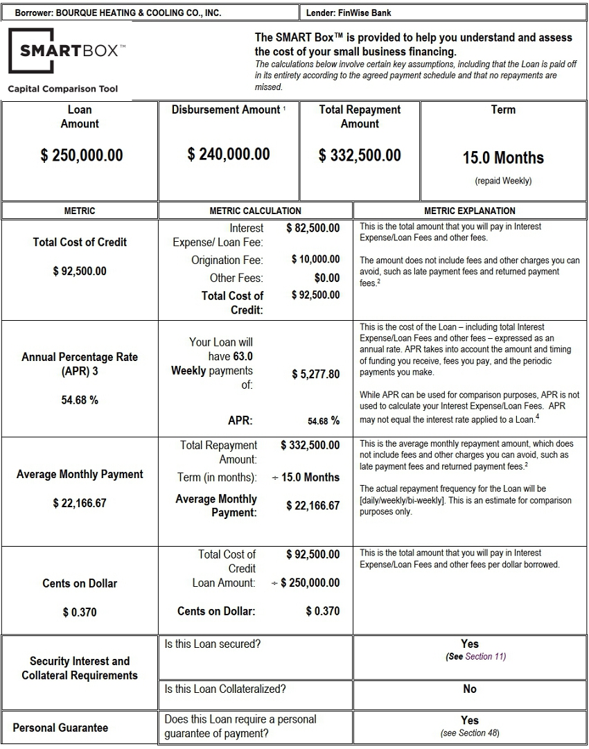Attached to this Business Loan and Security Agreement Supplement is a SMART Box™ Capital Comparison Tool, which is provided to help you understand and assess the cost of your small business financing in a variety of different ways, in order to assist that understanding as fully as possible.