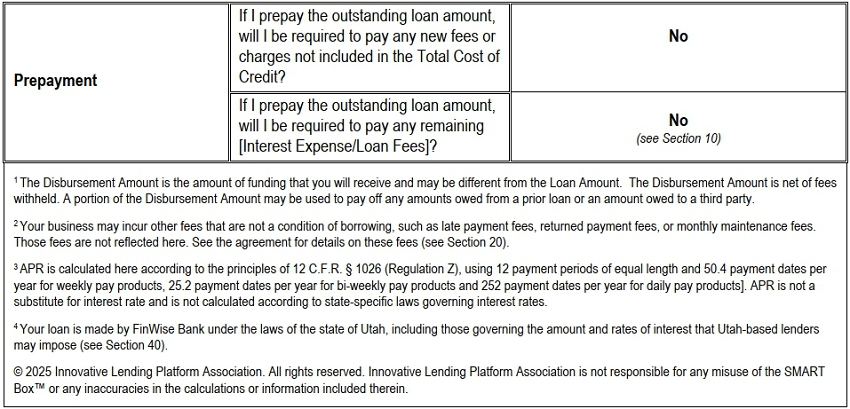 SECTION 10.             PREPAYMENT. Borrower may prepay Borrower’s Loan in whole on any Business Day by paying Lender the sum total of the Total Repayment Amount, and any Returned Payment Fees, in each case as described in the accompanying Business Loan and Security Agreement Supplement less (i) any Loan payments made prior to such prepayment; and (ii) the product of (X) the percentage identified as the applicable Prepayment Discount Percentage in the accompanying Business Loan and Security Agreement Supplement; and (Y) the aggregate amount interest remaining on the Borrower’s Loan as of such date as determined by Lender’s records in accordance with Section 8, provided however that (a) at the time of the prepayment in question, Borrower’s account is current and in good standing, and Borrower is not in breach of any of the terms of The Agreement; (b) this discount shall only be applicable if the payment in question is made directly from the Designated Checking Account, and not from the account of any other lender which is a competitor of the Lender's; (c) the payment is not effectively funded by the receipt by the Borrower of a loan or advance provided by a direct competitor of the Lender’s. Borrower may prepay Borrower’s Loan in part on any Business Day and such payment shall be applied against the Total Repayment Amount, and any Returned Payment Fees, in each case as described in the accompanying Borrower’s Business Loan and Security Agreement Supplement.