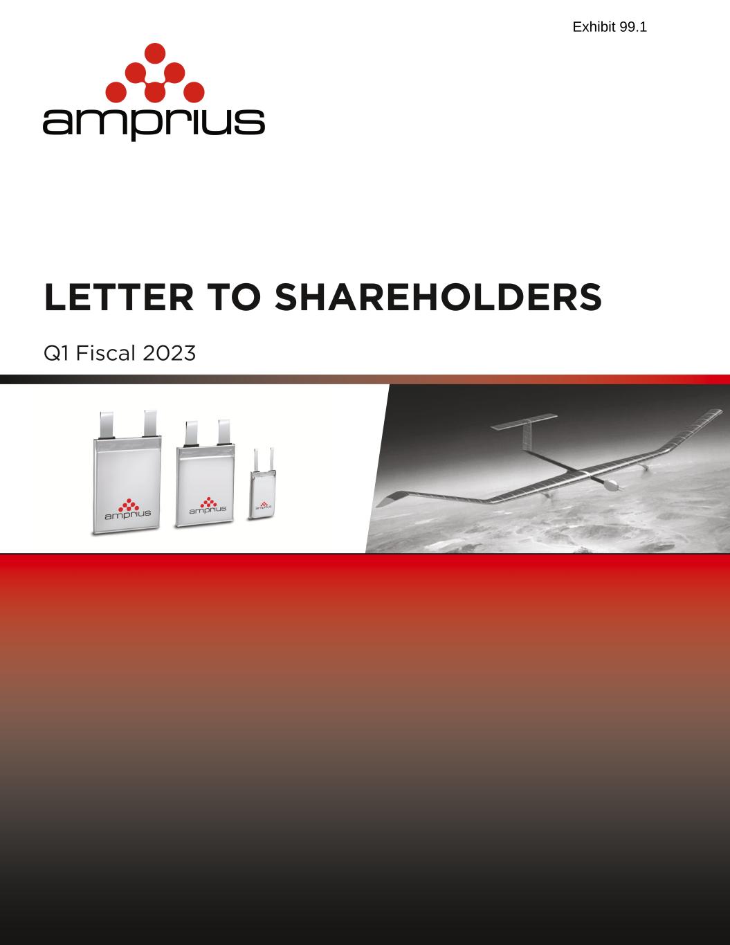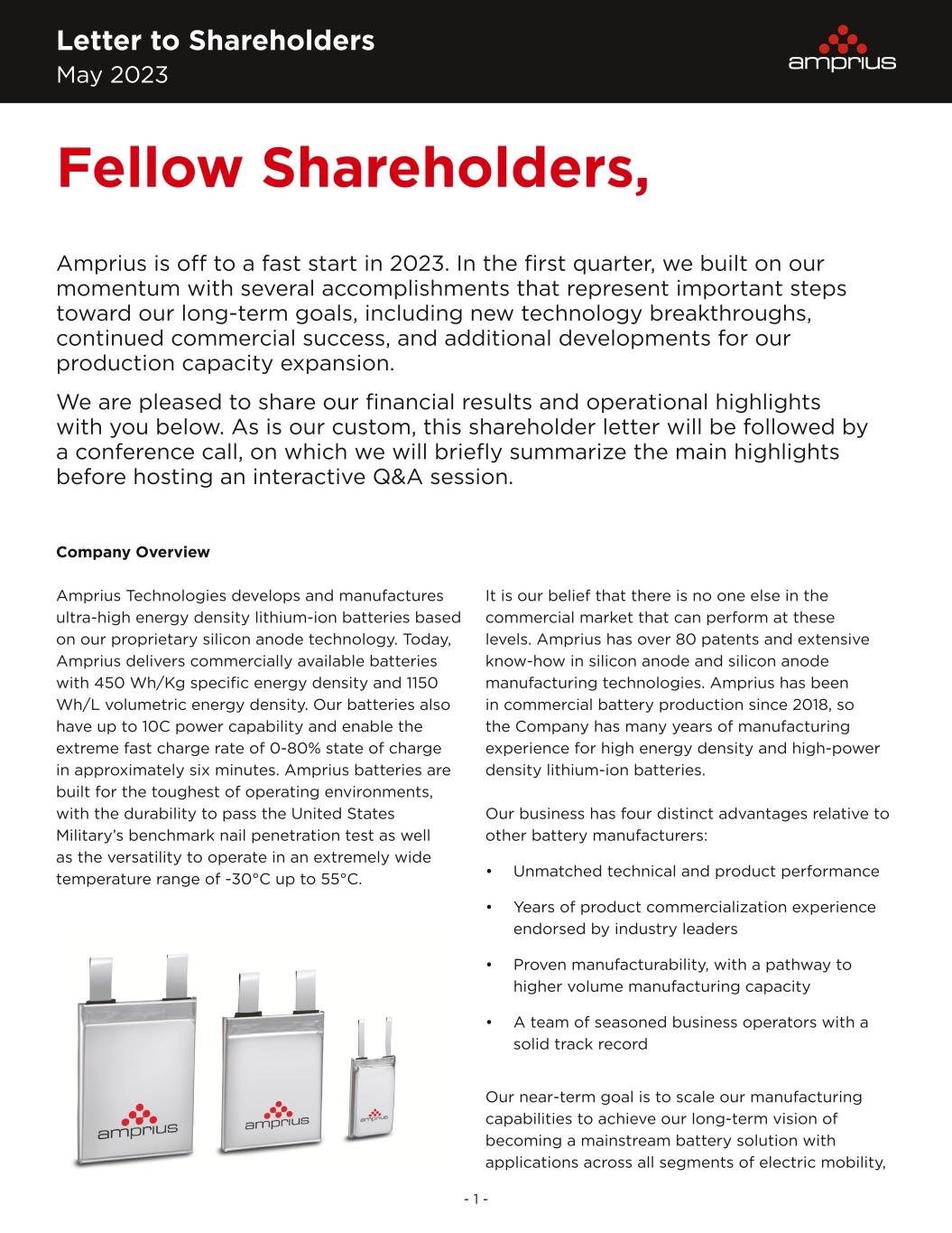 Letter to Shareholders May 2023 - 1 - Company Overview Amprius Technologies develops and manufactures ultra-high energy density lithium-ion batteries based on our proprietary silicon anode technology. Today, Amprius delivers commercially available batteries with 450 Wh/Kg specific energy density and 1150 Wh/L volumetric energy density. Our batteries also have up to 10C power capability and enable the extreme fast charge rate of 0-80% state of charge in approximately six minutes. Amprius batteries are built for the toughest of operating environments, with the durability to pass the United States Military’s benchmark nail penetration test as well as the versatility to operate in an extremely wide temperature range of -30°C up to 55°C. It is our belief that there is no one else in the commercial market that can perform at these levels. Amprius has over 80 patents and extensive know-how in silicon anode and silicon anode manufacturing technologies. Amprius has been in commercial battery production since 2018, so the Company has many years of manufacturing experience for high energy density and high-power density lithium-ion batteries. Our business has four distinct advantages relative to other battery manufacturers: • Unmatched technical and product performance • Years of product commercialization experience endorsed by industry leaders • Proven manufacturability, with a pathway to higher volume manufacturing capacity • A team of seasoned business operators with a solid track record Our near-term goal is to scale our manufacturing capabilities to achieve our long-term vision of becoming a mainstream battery solution with applications across all segments of electric mobility, Fellow Shareholders, Amprius is off to a fast start in 2023. In the first quarter, we built on our momentum with several accomplishments that represent important steps toward our long-term goals, including new technology breakthroughs, continued commercial success, and additional developments for our production capacity expansion. We are pleased to share our financial results and operational highlights with you below. As is our custom, this shareholder letter will be followed by a conference call, on which we will briefly summarize the main highlights before hosting an interactive Q&A session.