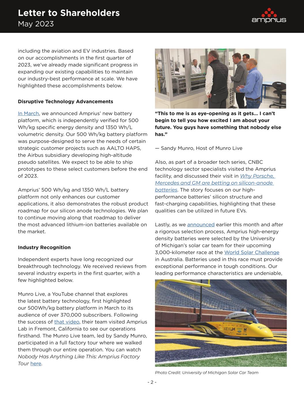 Letter to Shareholders May 2023 - 2 - including the aviation and EV industries. Based on our accomplishments in the first quarter of 2023, we’ve already made significant progress in expanding our existing capabilities to maintain our industry-best performance at scale. We have highlighted these accomplishments below. Disruptive Technology Advancements In March, we announced Amprius’ new battery platform, which is independently verified for 500 Wh/kg specific energy density and 1350 Wh/L volumetric density. Our 500 Wh/kg battery platform was purpose-designed to serve the needs of certain strategic customer projects such as AALTO HAPS, the Airbus subsidiary developing high-altitude pseudo satellites. We expect to be able to ship prototypes to these select customers before the end of 2023. Amprius’ 500 Wh/kg and 1350 Wh/L battery platform not only enhances our customer applications, it also demonstrates the robust product roadmap for our silicon anode technologies. We plan to continue moving along that roadmap to deliver the most advanced lithium-ion batteries available on the market. Industry Recognition Independent experts have long recognized our breakthrough technology. We received reviews from several industry experts in the first quarter, with a few highlighted below. Munro Live, a YouTube channel that explores the latest battery technology, first highlighted our 500Wh/kg battery platform in March to its audience of over 370,000 subscribers. Following the success of that video, their team visited Amprius Lab in Fremont, California to see our operations firsthand. The Munro Live team, led by Sandy Munro, participated in a full factory tour where we walked them through our entire operation. You can watch Nobody Has Anything Like This: Amprius Factory Tour here. “This to me is as eye-opening as it gets… I can’t begin to tell you how excited I am about your future. You guys have something that nobody else has.” — Sandy Munro, Host of Munro Live Also, as part of a broader tech series, CNBC technology sector specialists visited the Amprius facility, and discussed their visit in Why Porsche, Mercedes and GM are betting on silicon-anode batteries. The story focuses on our high- performance batteries’ silicon structure and fast-charging capabilities, highlighting that these qualities can be utilized in future EVs. Lastly, as we announced earlier this month and after a rigorous selection process, Amprius high-energy density batteries were selected by the University of Michigan’s solar car team for their upcoming 3,000-kilometer race at the World Solar Challenge in Australia. Batteries used in this race must provide exceptional performance in tough conditions. Our leading performance characteristics are undeniable, Photo Credit: University of Michigan Solar Car Team