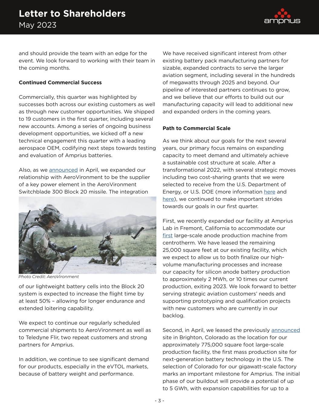 Letter to Shareholders May 2023 - 3 - and should provide the team with an edge for the event. We look forward to working with their team in the coming months. Continued Commercial Success Commercially, this quarter was highlighted by successes both across our existing customers as well as through new customer opportunities. We shipped to 19 customers in the first quarter, including several new accounts. Among a series of ongoing business development opportunities, we kicked off a new technical engagement this quarter with a leading aerospace OEM, codifying next steps towards testing and evaluation of Amprius batteries. Also, as we announced in April, we expanded our relationship with AeroVironment to be the supplier of a key power element in the AeroVironment Switchblade 300 Block 20 missile. The integration of our lightweight battery cells into the Block 20 system is expected to increase the flight time by at least 50% – allowing for longer endurance and extended loitering capability. We expect to continue our regularly scheduled commercial shipments to AeroVironment as well as to Teledyne Flir, two repeat customers and strong partners for Amprius. In addition, we continue to see significant demand for our products, especially in the eVTOL markets, because of battery weight and performance. We have received significant interest from other existing battery pack manufacturing partners for sizable, expanded contracts to serve the larger aviation segment, including several in the hundreds of megawatts through 2025 and beyond. Our pipeline of interested partners continues to grow, and we believe that our efforts to build out our manufacturing capacity will lead to additional new and expanded orders in the coming years. Path to Commercial Scale As we think about our goals for the next several years, our primary focus remains on expanding capacity to meet demand and ultimately achieve a sustainable cost structure at scale. After a transformational 2022, with several strategic moves including two cost-sharing grants that we were selected to receive from the U.S. Department of Energy, or U.S. DOE (more information here and here), we continued to make important strides towards our goals in our first quarter. First, we recently expanded our facility at Amprius Lab in Fremont, California to accommodate our first large-scale anode production machine from centrotherm. We have leased the remaining 25,000 square feet at our existing facility, which we expect to allow us to both finalize our high- volume manufacturing processes and increase our capacity for silicon anode battery production to approximately 2 MWh, or 10 times our current production, exiting 2023. We look forward to better serving strategic aviation customers’ needs and supporting prototyping and qualification projects with new customers who are currently in our backlog. Second, in April, we leased the previously announced site in Brighton, Colorado as the location for our approximately 775,000 square foot large-scale production facility, the first mass production site for next-generation battery technology in the U.S. The selection of Colorado for our gigawatt-scale factory marks an important milestone for Amprius. The initial phase of our buildout will provide a potential of up to 5 GWh, with expansion capabilities for up to a Photo Credit: AeroVironment
