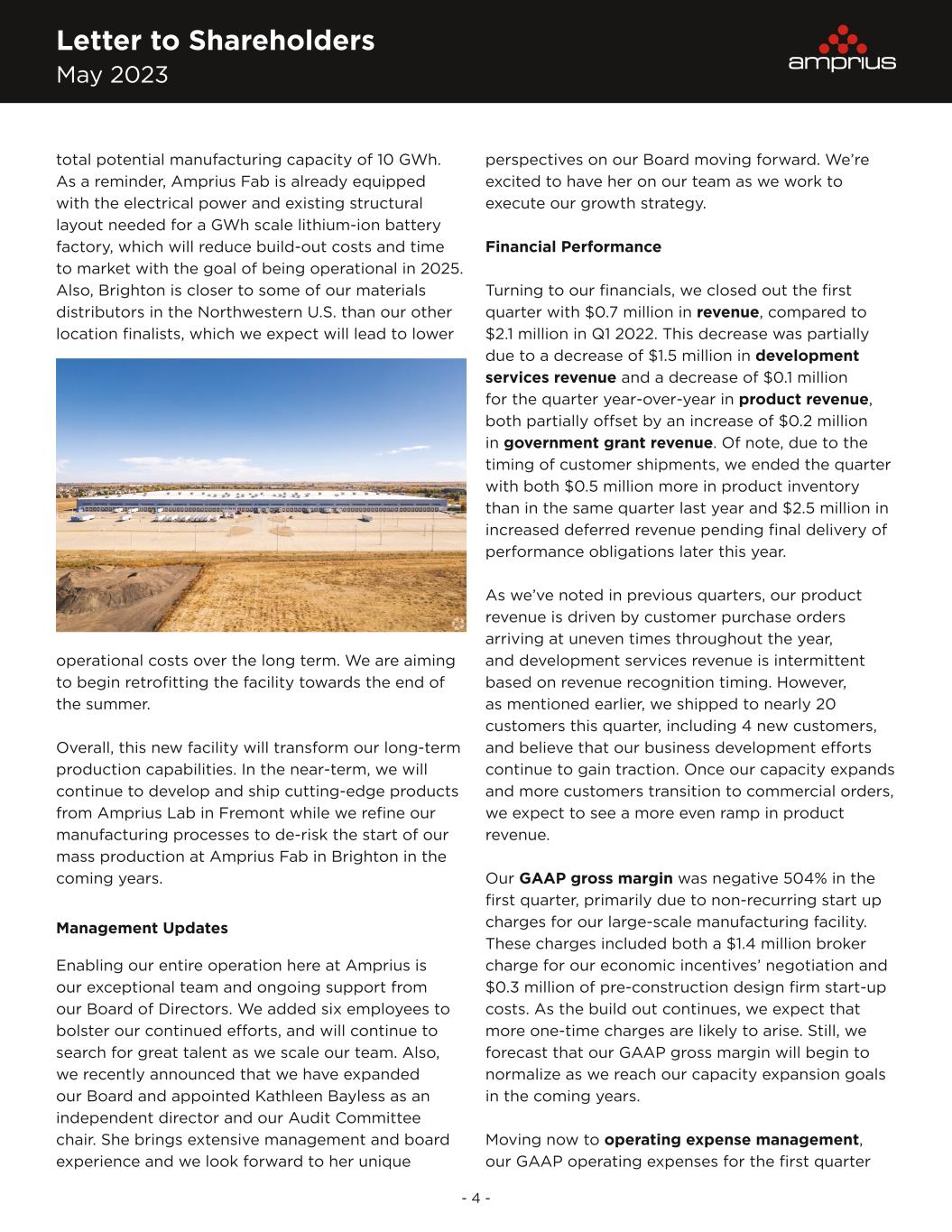 Letter to Shareholders May 2023 - 4 - total potential manufacturing capacity of 10 GWh. As a reminder, Amprius Fab is already equipped with the electrical power and existing structural layout needed for a GWh scale lithium-ion battery factory, which will reduce build-out costs and time to market with the goal of being operational in 2025. Also, Brighton is closer to some of our materials distributors in the Northwestern U.S. than our other location finalists, which we expect will lead to lower operational costs over the long term. We are aiming to begin retrofitting the facility towards the end of the summer. Overall, this new facility will transform our long-term production capabilities. In the near-term, we will continue to develop and ship cutting-edge products from Amprius Lab in Fremont while we refine our manufacturing processes to de-risk the start of our mass production at Amprius Fab in Brighton in the coming years. Management Updates Enabling our entire operation here at Amprius is our exceptional team and ongoing support from our Board of Directors. We added six employees to bolster our continued efforts, and will continue to search for great talent as we scale our team. Also, we recently announced that we have expanded our Board and appointed Kathleen Bayless as an independent director and our Audit Committee chair. She brings extensive management and board experience and we look forward to her unique perspectives on our Board moving forward. We’re excited to have her on our team as we work to execute our growth strategy. Financial Performance Turning to our financials, we closed out the first quarter with $0.7 million in revenue, compared to $2.1 million in Q1 2022. This decrease was partially due to a decrease of $1.5 million in development services revenue and a decrease of $0.1 million for the quarter year-over-year in product revenue, both partially offset by an increase of $0.2 million in government grant revenue. Of note, due to the timing of customer shipments, we ended the quarter with both $0.5 million more in product inventory than in the same quarter last year and $2.5 million in increased deferred revenue pending final delivery of performance obligations later this year. As we’ve noted in previous quarters, our product revenue is driven by customer purchase orders arriving at uneven times throughout the year, and development services revenue is intermittent based on revenue recognition timing. However, as mentioned earlier, we shipped to nearly 20 customers this quarter, including 4 new customers, and believe that our business development efforts continue to gain traction. Once our capacity expands and more customers transition to commercial orders, we expect to see a more even ramp in product revenue. Our GAAP gross margin was negative 504% in the first quarter, primarily due to non-recurring start up charges for our large-scale manufacturing facility. These charges included both a $1.4 million broker charge for our economic incentives’ negotiation and $0.3 million of pre-construction design firm start-up costs. As the build out continues, we expect that more one-time charges are likely to arise. Still, we forecast that our GAAP gross margin will begin to normalize as we reach our capacity expansion goals in the coming years. Moving now to operating expense management, our GAAP operating expenses for the first quarter