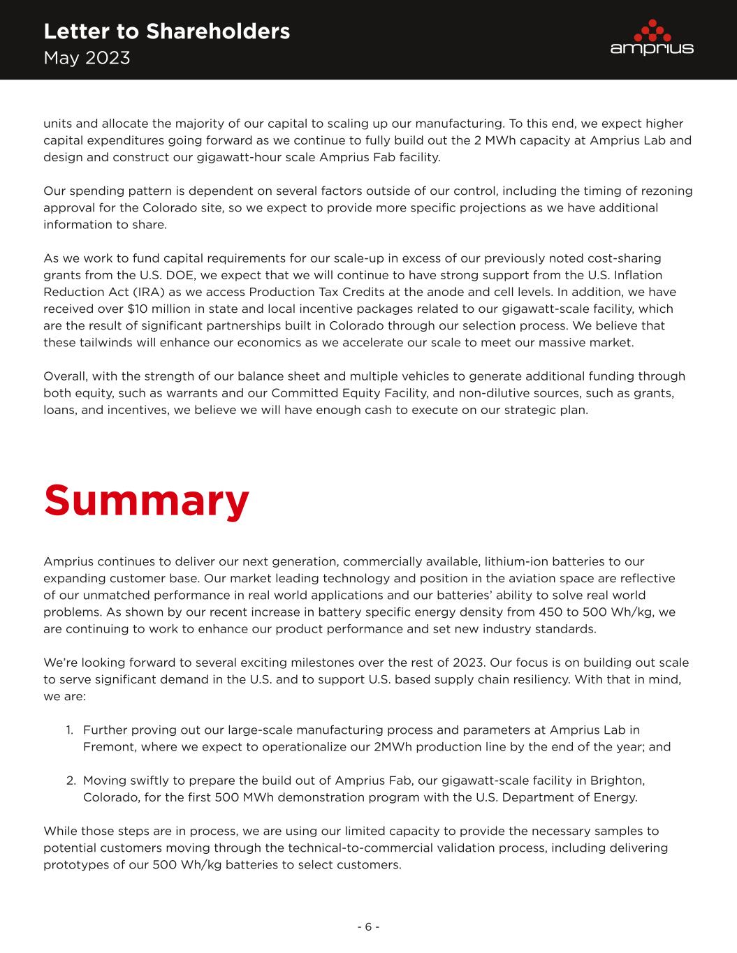 Letter to Shareholders May 2023 - 6 - units and allocate the majority of our capital to scaling up our manufacturing. To this end, we expect higher capital expenditures going forward as we continue to fully build out the 2 MWh capacity at Amprius Lab and design and construct our gigawatt-hour scale Amprius Fab facility. Our spending pattern is dependent on several factors outside of our control, including the timing of rezoning approval for the Colorado site, so we expect to provide more specific projections as we have additional information to share. As we work to fund capital requirements for our scale-up in excess of our previously noted cost-sharing grants from the U.S. DOE, we expect that we will continue to have strong support from the U.S. Inflation Reduction Act (IRA) as we access Production Tax Credits at the anode and cell levels. In addition, we have received over $10 million in state and local incentive packages related to our gigawatt-scale facility, which are the result of significant partnerships built in Colorado through our selection process. We believe that these tailwinds will enhance our economics as we accelerate our scale to meet our massive market. Overall, with the strength of our balance sheet and multiple vehicles to generate additional funding through both equity, such as warrants and our Committed Equity Facility, and non-dilutive sources, such as grants, loans, and incentives, we believe we will have enough cash to execute on our strategic plan. Summary Amprius continues to deliver our next generation, commercially available, lithium-ion batteries to our expanding customer base. Our market leading technology and position in the aviation space are reflective of our unmatched performance in real world applications and our batteries’ ability to solve real world problems. As shown by our recent increase in battery specific energy density from 450 to 500 Wh/kg, we are continuing to work to enhance our product performance and set new industry standards. We’re looking forward to several exciting milestones over the rest of 2023. Our focus is on building out scale to serve significant demand in the U.S. and to support U.S. based supply chain resiliency. With that in mind, we are: 1. Further proving out our large-scale manufacturing process and parameters at Amprius Lab in Fremont, where we expect to operationalize our 2MWh production line by the end of the year; and 2. Moving swiftly to prepare the build out of Amprius Fab, our gigawatt-scale facility in Brighton, Colorado, for the first 500 MWh demonstration program with the U.S. Department of Energy. While those steps are in process, we are using our limited capacity to provide the necessary samples to potential customers moving through the technical-to-commercial validation process, including delivering prototypes of our 500 Wh/kg batteries to select customers.