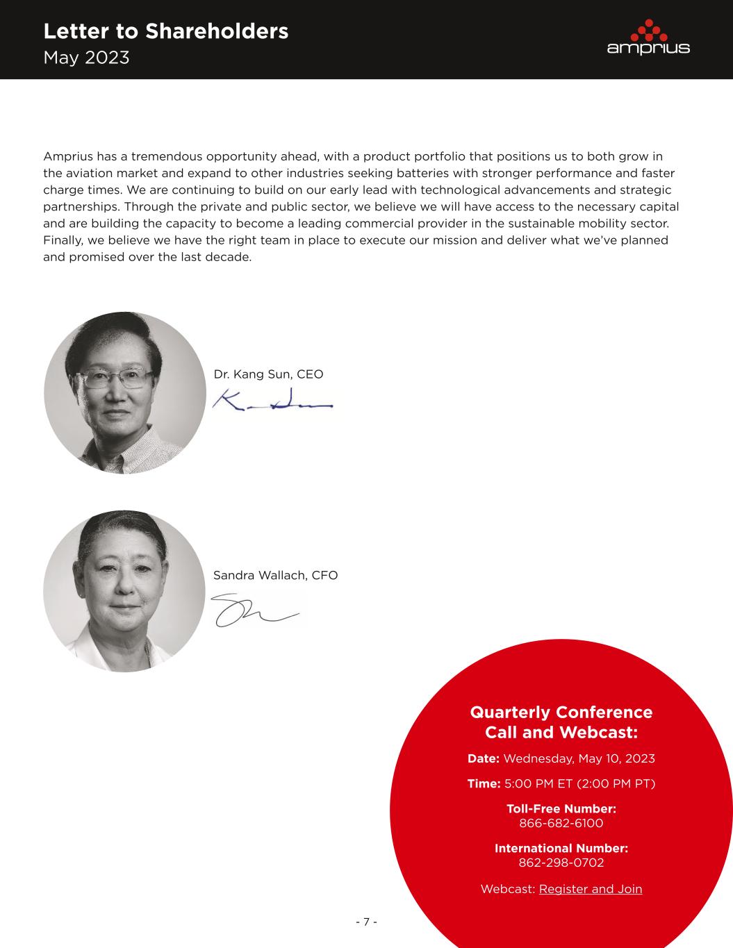 Letter to Shareholders May 2023 - 7 - Amprius has a tremendous opportunity ahead, with a product portfolio that positions us to both grow in the aviation market and expand to other industries seeking batteries with stronger performance and faster charge times. We are continuing to build on our early lead with technological advancements and strategic partnerships. Through the private and public sector, we believe we will have access to the necessary capital and are building the capacity to become a leading commercial provider in the sustainable mobility sector. Finally, we believe we have the right team in place to execute our mission and deliver what we’ve planned and promised over the last decade. Quarterly Conference Call and Webcast: Date: Wednesday, May 10, 2023 Time: 5:00 PM ET (2:00 PM PT) Toll-Free Number: 866-682-6100 International Number: 862-298-0702 Webcast: Register and Join Dr. Kang Sun, CEO Sandra Wallach, CFO