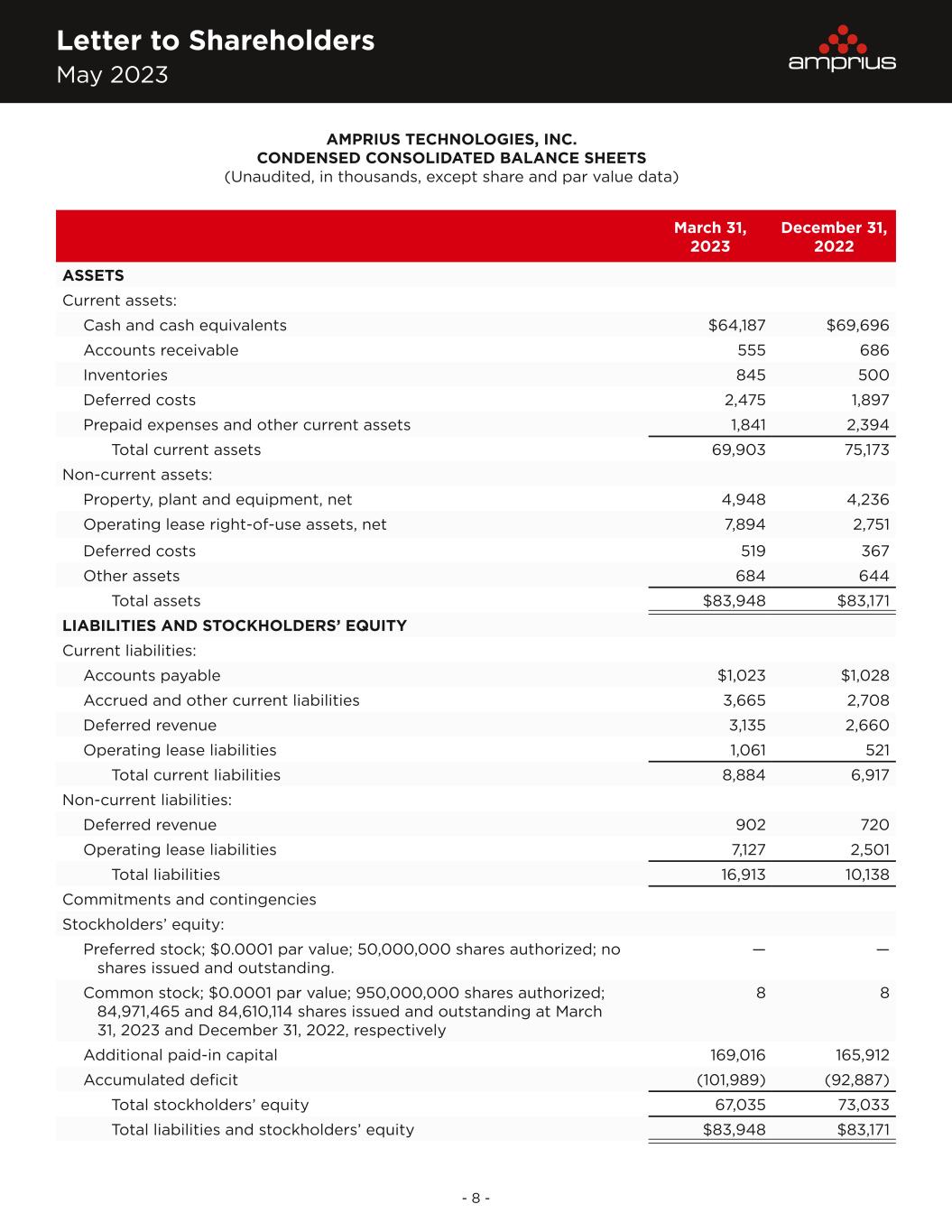Letter to Shareholders May 2023 - 8 - AMPRIUS TECHNOLOGIES, INC. CONDENSED CONSOLIDATED BALANCE SHEETS (Unaudited, in thousands, except share and par value data) March 31, 2023 December 31, 2022 ASSETS Current assets: Cash and cash equivalents $64,187 $69,696 Accounts receivable 555 686 Inventories 845 500 Deferred costs 2,475 1,897 Prepaid expenses and other current assets 1,841 2,394 Total current assets 69,903 75,173 Non-current assets: Property, plant and equipment, net 4,948 4,236 Operating lease right-of-use assets, net 7,894 2,751 Deferred costs 519 367 Other assets 684 644 Total assets $83,948 $83,171 LIABILITIES AND STOCKHOLDERS’ EQUITY Current liabilities: Accounts payable $1,023 $1,028 Accrued and other current liabilities 3,665 2,708 Deferred revenue 3,135 2,660 Operating lease liabilities 1,061 521 Total current liabilities 8,884 6,917 Non-current liabilities: Deferred revenue 902 720 Operating lease liabilities 7,127 2,501 Total liabilities 16,913 10,138 Commitments and contingencies Stockholders’ equity: Preferred stock; $0.0001 par value; 50,000,000 shares authorized; no shares issued and outstanding. — — Common stock; $0.0001 par value; 950,000,000 shares authorized; 84,971,465 and 84,610,114 shares issued and outstanding at March 31, 2023 and December 31, 2022, respectively 8 8 Additional paid-in capital 169,016 165,912 Accumulated deficit (101,989) (92,887) Total stockholders’ equity 67,035 73,033 Total liabilities and stockholders’ equity $83,948 $83,171
