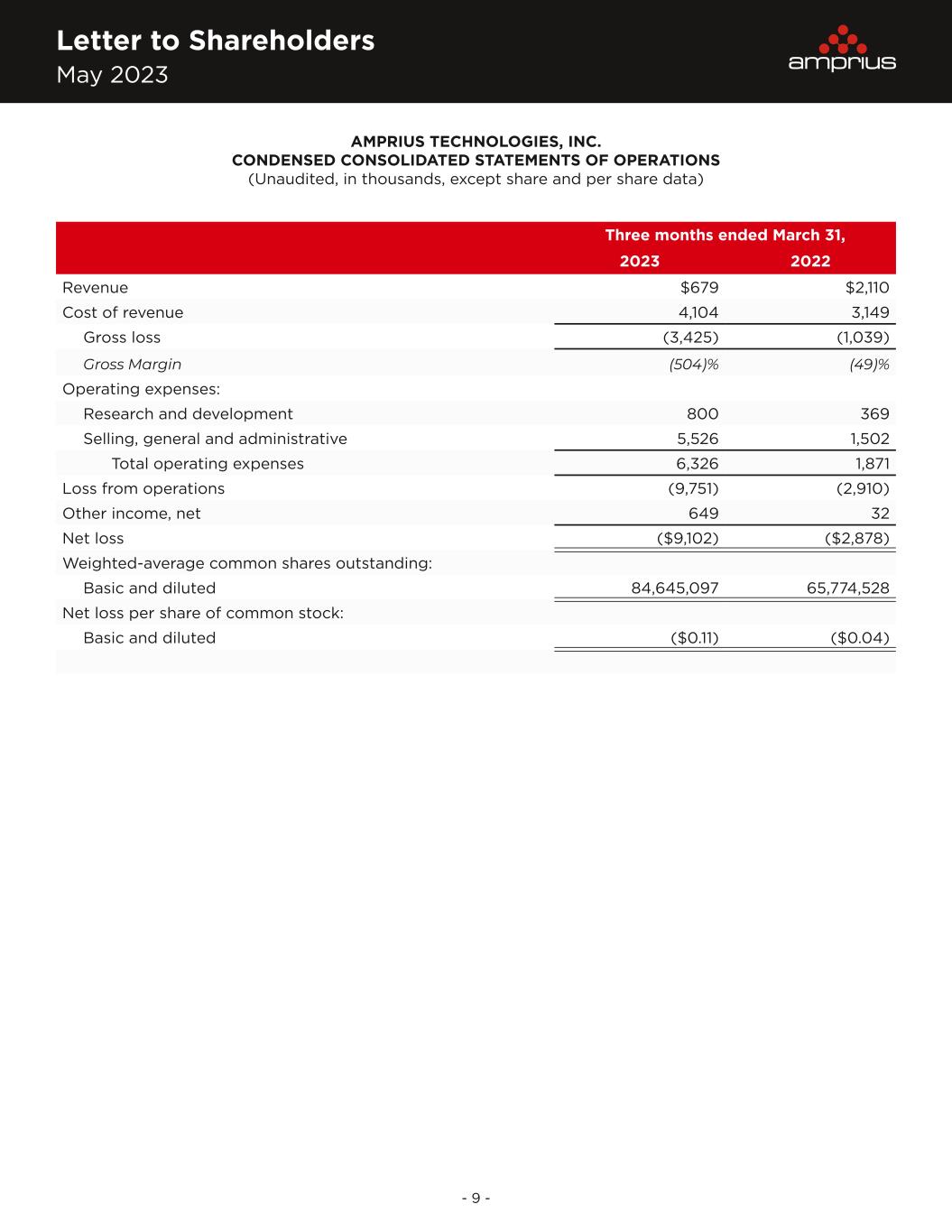 Letter to Shareholders May 2023 - 9 - Three months ended March 31, 2023 2022 Revenue $679 $2,110 Cost of revenue 4,104 3,149 Gross loss (3,425) (1,039) Gross Margin (504)% (49)% Operating expenses: Research and development 800 369 Selling, general and administrative 5,526 1,502 Total operating expenses 6,326 1,871 Loss from operations (9,751) (2,910) Other income, net 649 32 Net loss ($9,102) ($2,878) Weighted-average common shares outstanding: Basic and diluted 84,645,097 65,774,528 Net loss per share of common stock: Basic and diluted ($0.11) ($0.04) AMPRIUS TECHNOLOGIES, INC. CONDENSED CONSOLIDATED STATEMENTS OF OPERATIONS (Unaudited, in thousands, except share and per share data)