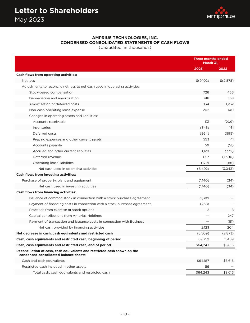 Letter to Shareholders May 2023 - 10 - AMPRIUS TECHNOLOGIES, INC. CONDENSED CONSOLIDATED STATEMENTS OF CASH FLOWS (Unaudited, in thousands) Three months ended March 31, 2023 2022 Cash flows from operating activities: Net loss $(9,102) $(2,878) Adjustments to reconcile net loss to net cash used in operating activities: Stock-based compensation 726 456 Depreciation and amortization 416 358 Amortization of deferred costs 134 1,252 Non-cash operating lease expense 202 140 Changes in operating assets and liabilities: Accounts receivable 131 (209) Inventories (345) 161 Deferred costs (864) (595) Prepaid expenses and other current assets 553 41 Accounts payable 59 (51) Accrued and other current liabilities 1,120 (332) Deferred revenue 657 (1,300) Operating lease liabilities (179) (86) Net cash used in operating activities (6,492) (3,043) Cash flows from investing activities: Purchase of property, plant and equipment (1,140) (34) Net cash used in investing activities (1,140) (34) Cash flows from financing activities: Issuance of common stock in connection with a stock purchase agreement 2,389 — Payment of financing costs in connection with a stock purchase agreement (268) — Proceeds from exercise of stock options 2 8 Capital contributions from Amprius Holdings — 247 Payment of transaction and issuance costs in connection with Business — (51) Net cash provided by financing activities 2,123 204 Net decrease in cash, cash equivalents and restricted cash (5,509) (2,873) Cash, cash equivalents and restricted cash, beginning of period 69,752 11,489 Cash, cash equivalents and restricted cash, end of period $64,243 $8,616 Reconciliation of cash, cash equivalents and restricted cash shown on the condensed consolidated balance sheets: Cash and cash equivalents $64,187 $8,616 Restricted cash included in other assets 56 — Total cash, cash equivalents and restricted cash $64,243 $8,616