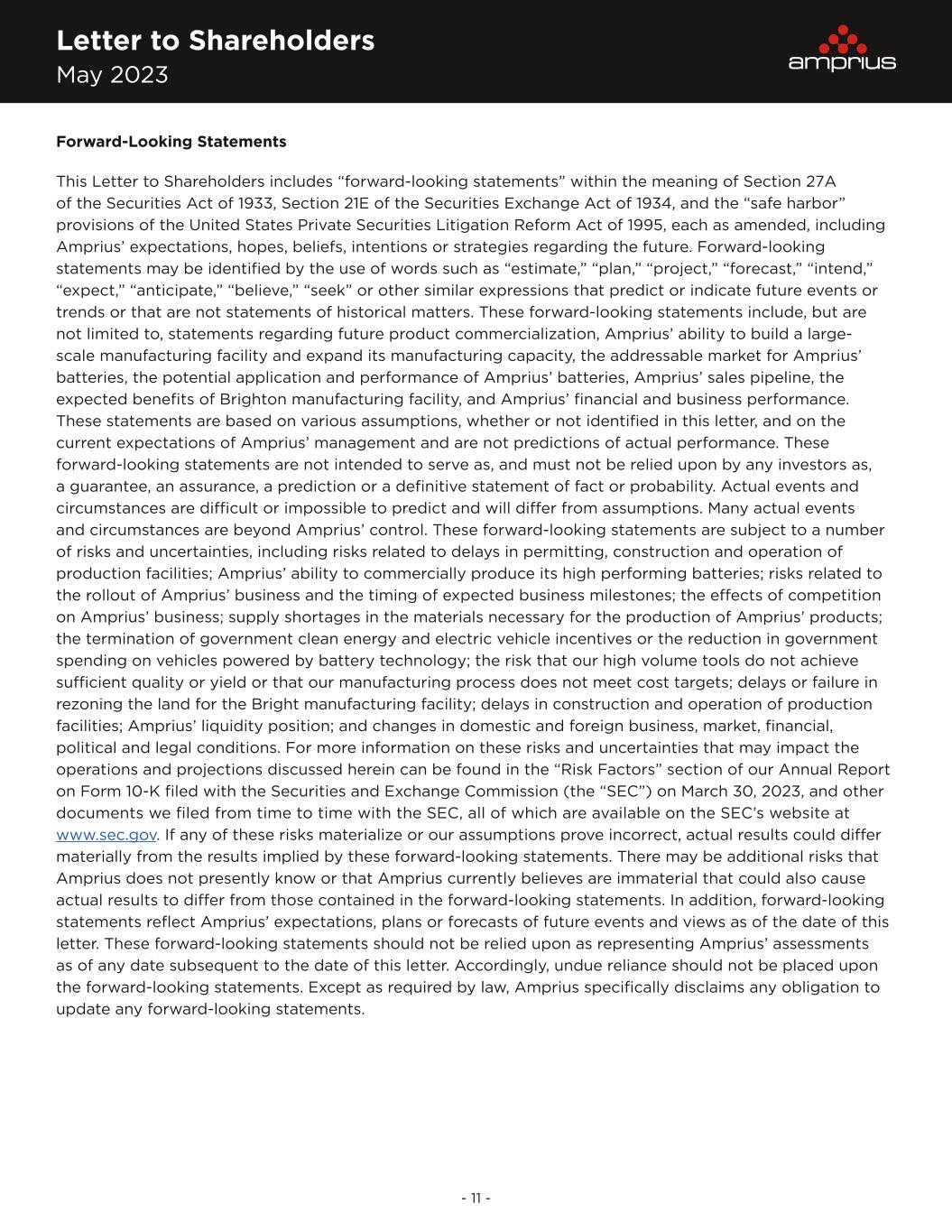 Letter to Shareholders May 2023 - 11 - Forward-Looking Statements This Letter to Shareholders includes “forward-looking statements” within the meaning of Section 27A of the Securities Act of 1933, Section 21E of the Securities Exchange Act of 1934, and the “safe harbor” provisions of the United States Private Securities Litigation Reform Act of 1995, each as amended, including Amprius’ expectations, hopes, beliefs, intentions or strategies regarding the future. Forward-looking statements may be identified by the use of words such as “estimate,” “plan,” “project,” “forecast,” “intend,” “expect,” “anticipate,” “believe,” “seek” or other similar expressions that predict or indicate future events or trends or that are not statements of historical matters. These forward-looking statements include, but are not limited to, statements regarding future product commercialization, Amprius’ ability to build a large- scale manufacturing facility and expand its manufacturing capacity, the addressable market for Amprius’ batteries, the potential application and performance of Amprius’ batteries, Amprius’ sales pipeline, the expected benefits of Brighton manufacturing facility, and Amprius’ financial and business performance. These statements are based on various assumptions, whether or not identified in this letter, and on the current expectations of Amprius’ management and are not predictions of actual performance. These forward-looking statements are not intended to serve as, and must not be relied upon by any investors as, a guarantee, an assurance, a prediction or a definitive statement of fact or probability. Actual events and circumstances are difficult or impossible to predict and will differ from assumptions. Many actual events and circumstances are beyond Amprius’ control. These forward-looking statements are subject to a number of risks and uncertainties, including risks related to delays in permitting, construction and operation of production facilities; Amprius’ ability to commercially produce its high performing batteries; risks related to the rollout of Amprius’ business and the timing of expected business milestones; the effects of competition on Amprius’ business; supply shortages in the materials necessary for the production of Amprius’ products; the termination of government clean energy and electric vehicle incentives or the reduction in government spending on vehicles powered by battery technology; the risk that our high volume tools do not achieve sufficient quality or yield or that our manufacturing process does not meet cost targets; delays or failure in rezoning the land for the Bright manufacturing facility; delays in construction and operation of production facilities; Amprius’ liquidity position; and changes in domestic and foreign business, market, financial, political and legal conditions. For more information on these risks and uncertainties that may impact the operations and projections discussed herein can be found in the “Risk Factors” section of our Annual Report on Form 10-K filed with the Securities and Exchange Commission (the “SEC”) on March 30, 2023, and other documents we filed from time to time with the SEC, all of which are available on the SEC’s website at www.sec.gov. If any of these risks materialize or our assumptions prove incorrect, actual results could differ materially from the results implied by these forward-looking statements. There may be additional risks that Amprius does not presently know or that Amprius currently believes are immaterial that could also cause actual results to differ from those contained in the forward-looking statements. In addition, forward-looking statements reflect Amprius’ expectations, plans or forecasts of future events and views as of the date of this letter. These forward-looking statements should not be relied upon as representing Amprius’ assessments as of any date subsequent to the date of this letter. Accordingly, undue reliance should not be placed upon the forward-looking statements. Except as required by law, Amprius specifically disclaims any obligation to update any forward-looking statements.