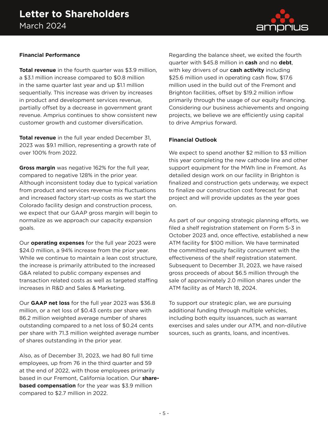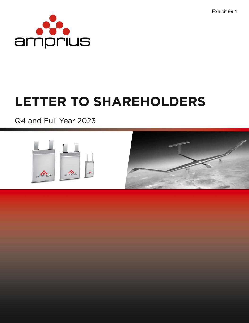 Letter to Shareholders March 2024 - 5 - Financial Performance Total revenue in the fourth quarter was $3.9 million, a $3.1 million increase compared to $0.8 million in the same quarter last year and up $1.1 million sequentially. This increase was driven by increases in product and development services revenue, partially offset by a decrease in government grant revenue. Amprius continues to show consistent new customer growth and customer diversification. Total revenue in the full year ended December 31, 2023 was $9.1 million, representing a growth rate of over 100% from 2022. Gross margin was negative 162% for the full year, compared to negative 128% in the prior year. Although inconsistent today due to typical variation from product and services revenue mix fluctuations and increased factory start-up costs as we start the Colorado facility design and construction process, we expect that our GAAP gross margin will begin to normalize as we approach our capacity expansion goals. Our operating expenses for the full year 2023 were $24.0 million, a 94% increase from the prior year. While we continue to maintain a lean cost structure, the increase is primarily attributed to the increased G&A related to public company expenses and transaction related costs as well as targeted staffing increases in R&D and Sales & Marketing. Our GAAP net loss for the full year 2023 was $36.8 million, or a net loss of $0.43 cents per share with 86.2 million weighted average number of shares outstanding compared to a net loss of $0.24 cents per share with 71.3 million weighted average number of shares outstanding in the prior year. Also, as of December 31, 2023, we had 80 full time employees, up from 76 in the third quarter and 59 at the end of 2022, with those employees primarily based in our Fremont, California location. Our share- based compensation for the year was $3.9 million compared to $2.7 million in 2022. Regarding the balance sheet, we exited the fourth quarter with $45.8 million in cash and no debt, with key drivers of our cash activity including $25.6 million used in operating cash flow, $17.6 million used in the build out of the Fremont and Brighton facilities, offset by $19.2 million inflow primarily through the usage of our equity financing. Considering our business achievements and ongoing projects, we believe we are efficiently using capital to drive Amprius forward. Financial Outlook We expect to spend another $2 million to $3 million this year completing the new cathode line and other support equipment for the MWh line in Fremont. As detailed design work on our facility in Brighton is finalized and construction gets underway, we expect to finalize our construction cost forecast for that project and will provide updates as the year goes on. As part of our ongoing strategic planning efforts, we filed a shelf registration statement on Form S-3 in October 2023 and, once effective, established a new ATM facility for $100 million. We have terminated the committed equity facility concurrent with the effectiveness of the shelf registration statement. Subsequent to December 31, 2023, we have raised gross proceeds of about $6.5 million through the sale of approximately 2.0 million shares under the ATM facility as of March 18, 2024. To support our strategic plan, we are pursuing additional funding through multiple vehicles, including both equity issuances, such as warrant exercises and sales under our ATM, and non-dilutive sources, such as grants, loans, and incentives.