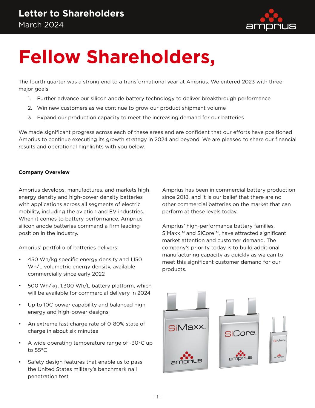 Letter to Shareholders March 2024 - 1 - Amprius has been in commercial battery production since 2018, and it is our belief that there are no other commercial batteries on the market that can perform at these levels today. Amprius’ high-performance battery families, SiMaxxTM and SiCoreTM, have attracted significant market attention and customer demand. The company’s priority today is to build additional manufacturing capacity as quickly as we can to meet this significant customer demand for our products. Company Overview Amprius develops, manufactures, and markets high energy density and high-power density batteries with applications across all segments of electric mobility, including the aviation and EV industries. When it comes to battery performance, Amprius’ silicon anode batteries command a firm leading position in the industry. Amprius’ portfolio of batteries delivers: • 450 Wh/kg specific energy density and 1,150 Wh/L volumetric energy density, available commercially since early 2022 • 500 Wh/kg, 1,300 Wh/L battery platform, which will be available for commercial delivery in 2024 • Up to 10C power capability and balanced high energy and high-power designs • An extreme fast charge rate of 0-80% state of charge in about six minutes • A wide operating temperature range of -30°C up to 55°C • Safety design features that enable us to pass the United States military’s benchmark nail penetration test Fellow Shareholders, The fourth quarter was a strong end to a transformational year at Amprius. We entered 2023 with three major goals: 1. Further advance our silicon anode battery technology to deliver breakthrough performance 2. Win new customers as we continue to grow our product shipment volume 3. Expand our production capacity to meet the increasing demand for our batteries We made significant progress across each of these areas and are confident that our efforts have positioned Amprius to continue executing its growth strategy in 2024 and beyond. We are pleased to share our financial results and operational highlights with you below.