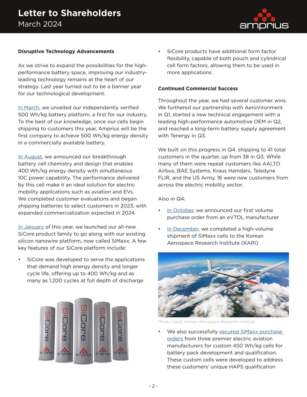 Letter to Shareholders March 2024 - 2 - Disruptive Technology Advancements As we strive to expand the possibilities for the high- performance battery space, improving our industry- leading technology remains at the heart of our strategy. Last year turned out to be a banner year for our technological development. In March, we unveiled our independently verified 500 Wh/kg battery platform, a first for our industry. To the best of our knowledge, once our cells begin shipping to customers this year, Amprius will be the first company to achieve 500 Wh/kg energy density in a commercially available battery. In August, we announced our breakthrough battery cell chemistry and design that enables 400 Wh/kg energy density with simultaneous 10C power capability. The performance delivered by this cell make it an ideal solution for electric mobility applications such as aviation and EVs. We completed customer evaluations and began shipping batteries to select customers in 2023, with expanded commercialization expected in 2024. In January of this year, we launched our all-new SiCore product family to go along with our existing silicon nanowire platform, now called SiMaxx. A few key features of our SiCore platform include: • SiCore was developed to serve the applications that demand high energy density and longer cycle life, offering up to 400 Wh/kg and as many as 1,200 cycles at full depth of discharge • SiCore products have additional form factor flexibility, capable of both pouch and cylindrical cell form factors, allowing them to be used in more applications Continued Commercial Success Throughout the year, we had several customer wins. We furthered our partnership with AeroVironment in Q1, started a new technical engagement with a leading high-performance automotive OEM in Q2, and reached a long-term battery supply agreement with Tenergy in Q3. We built on this progress in Q4, shipping to 41 total customers in the quarter, up from 38 in Q3. While many of them were repeat customers like AALTO Airbus, BAE Systems, Kraus Hamdani, Teledyne FLIR, and the US Army, 16 were new customers from across the electric mobility sector. Also in Q4: • In October, we announced our first volume purchase order from an eVTOL manufacturer • In December, we completed a high-volume shipment of SiMaxx cells to the Korean Aerospace Research Institute (KARI) • We also successfully secured SiMaxx purchase orders from three premier electric aviation manufacturers for custom 450 Wh/kg cells for battery pack development and qualification. These custom cells were developed to address these customers’ unique HAPS qualification Photo Credit: Korean Aerospace Research Institute