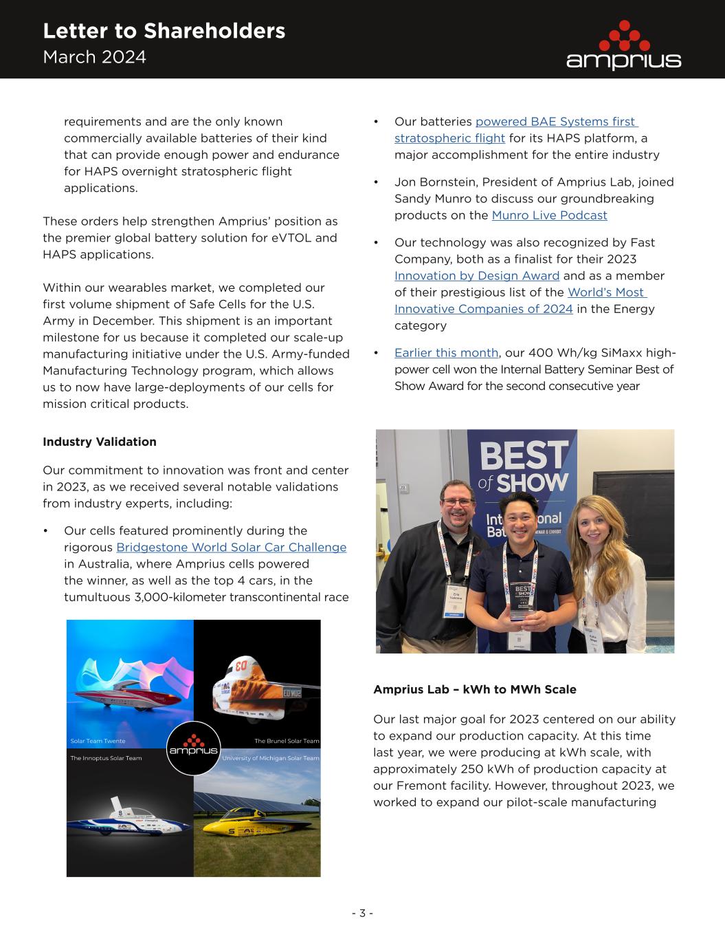 Letter to Shareholders March 2024 - 3 - requirements and are the only known commercially available batteries of their kind that can provide enough power and endurance for HAPS overnight stratospheric flight applications. These orders help strengthen Amprius’ position as the premier global battery solution for eVTOL and HAPS applications. Within our wearables market, we completed our first volume shipment of Safe Cells for the U.S. Army in December. This shipment is an important milestone for us because it completed our scale-up manufacturing initiative under the U.S. Army-funded Manufacturing Technology program, which allows us to now have large-deployments of our cells for mission critical products. Industry Validation Our commitment to innovation was front and center in 2023, as we received several notable validations from industry experts, including: • Our cells featured prominently during the rigorous Bridgestone World Solar Car Challenge in Australia, where Amprius cells powered the winner, as well as the top 4 cars, in the tumultuous 3,000-kilometer transcontinental race • Our batteries powered BAE Systems first stratospheric flight for its HAPS platform, a major accomplishment for the entire industry • Jon Bornstein, President of Amprius Lab, joined Sandy Munro to discuss our groundbreaking products on the Munro Live Podcast • Our technology was also recognized by Fast Company, both as a finalist for their 2023 Innovation by Design Award and as a member of their prestigious list of the World’s Most Innovative Companies of 2024 in the Energy category • Earlier this month, our 400 Wh/kg SiMaxx high- power cell won the Internal Battery Seminar Best of Show Award for the second consecutive year Amprius Lab – kWh to MWh Scale Our last major goal for 2023 centered on our ability to expand our production capacity. At this time last year, we were producing at kWh scale, with approximately 250 kWh of production capacity at our Fremont facility. However, throughout 2023, we worked to expand our pilot-scale manufacturing