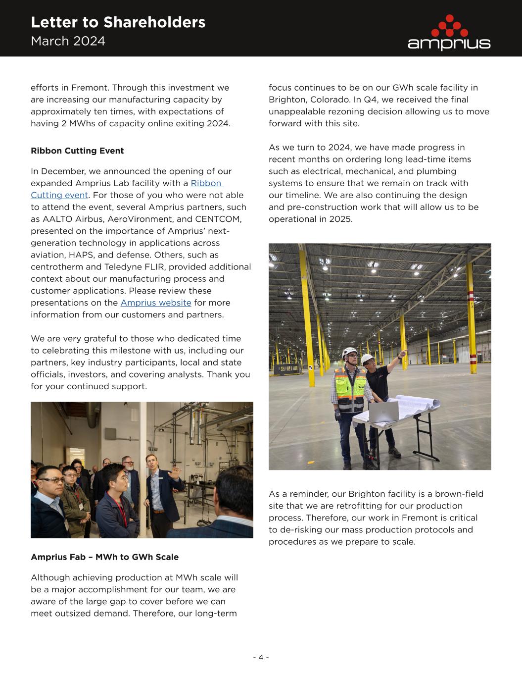 Letter to Shareholders March 2024 - 4 - efforts in Fremont. Through this investment we are increasing our manufacturing capacity by approximately ten times, with expectations of having 2 MWhs of capacity online exiting 2024. Ribbon Cutting Event In December, we announced the opening of our expanded Amprius Lab facility with a Ribbon Cutting event. For those of you who were not able to attend the event, several Amprius partners, such as AALTO Airbus, AeroVironment, and CENTCOM, presented on the importance of Amprius’ next- generation technology in applications across aviation, HAPS, and defense. Others, such as centrotherm and Teledyne FLIR, provided additional context about our manufacturing process and customer applications. Please review these presentations on the Amprius website for more information from our customers and partners. We are very grateful to those who dedicated time to celebrating this milestone with us, including our partners, key industry participants, local and state officials, investors, and covering analysts. Thank you for your continued support. Amprius Fab – MWh to GWh Scale Although achieving production at MWh scale will be a major accomplishment for our team, we are aware of the large gap to cover before we can meet outsized demand. Therefore, our long-term focus continues to be on our GWh scale facility in Brighton, Colorado. In Q4, we received the final unappealable rezoning decision allowing us to move forward with this site. As we turn to 2024, we have made progress in recent months on ordering long lead-time items such as electrical, mechanical, and plumbing systems to ensure that we remain on track with our timeline. We are also continuing the design and pre-construction work that will allow us to be operational in 2025. As a reminder, our Brighton facility is a brown-field site that we are retrofitting for our production process. Therefore, our work in Fremont is critical to de-risking our mass production protocols and procedures as we prepare to scale.