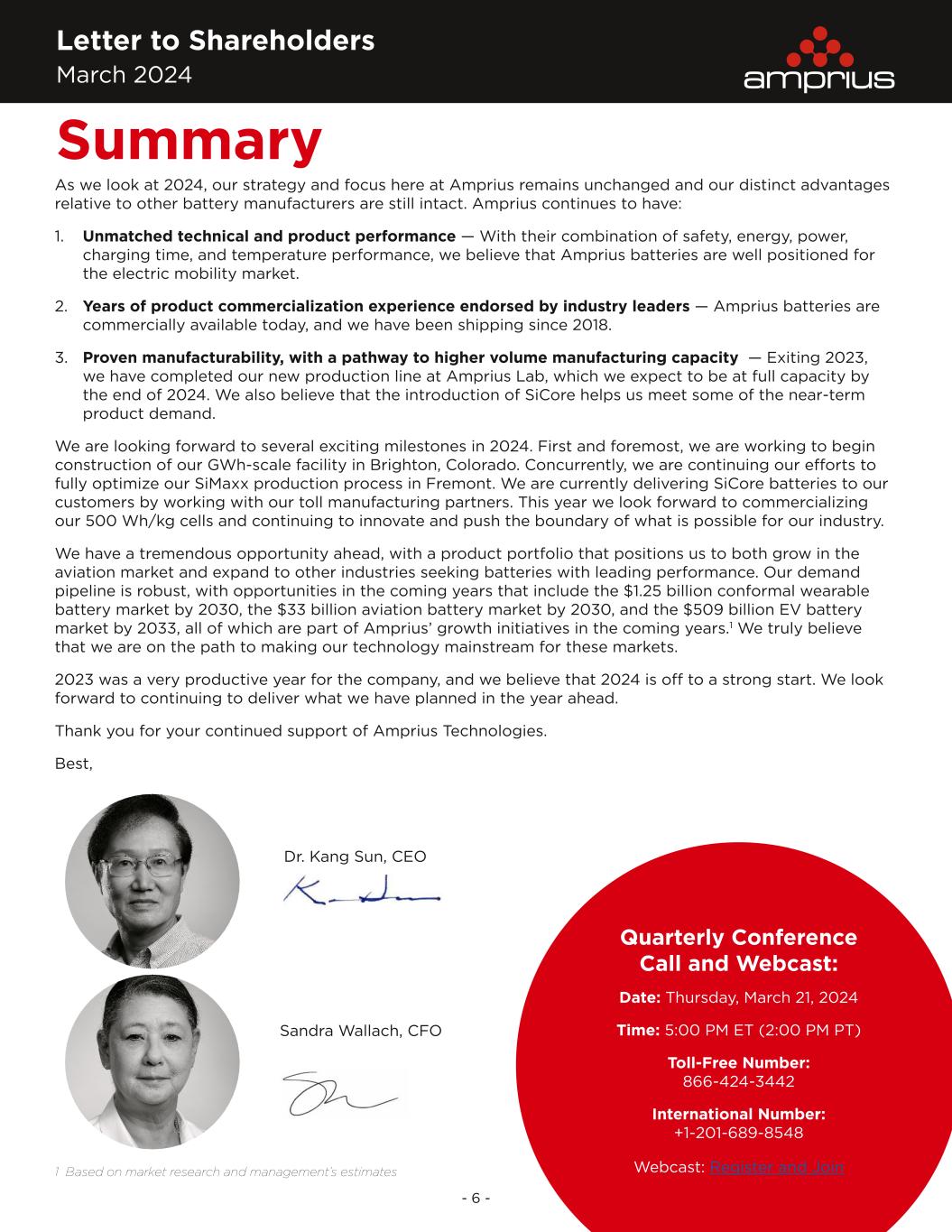 Letter to Shareholders March 2024 - 6 - Summary As we look at 2024, our strategy and focus here at Amprius remains unchanged and our distinct advantages relative to other battery manufacturers are still intact. Amprius continues to have: 1. Unmatched technical and product performance — With their combination of safety, energy, power, charging time, and temperature performance, we believe that Amprius batteries are well positioned for the electric mobility market. 2. Years of product commercialization experience endorsed by industry leaders — Amprius batteries are commercially available today, and we have been shipping since 2018. 3. Proven manufacturability, with a pathway to higher volume manufacturing capacity — Exiting 2023, we have completed our new production line at Amprius Lab, which we expect to be at full capacity by the end of 2024. We also believe that the introduction of SiCore helps us meet some of the near-term product demand. We are looking forward to several exciting milestones in 2024. First and foremost, we are working to begin construction of our GWh-scale facility in Brighton, Colorado. Concurrently, we are continuing our efforts to fully optimize our SiMaxx production process in Fremont. We are currently delivering SiCore batteries to our customers by working with our toll manufacturing partners. This year we look forward to commercializing our 500 Wh/kg cells and continuing to innovate and push the boundary of what is possible for our industry. We have a tremendous opportunity ahead, with a product portfolio that positions us to both grow in the aviation market and expand to other industries seeking batteries with leading performance. Our demand pipeline is robust, with opportunities in the coming years that include the $1.25 billion conformal wearable battery market by 2030, the $33 billion aviation battery market by 2030, and the $509 billion EV battery market by 2033, all of which are part of Amprius’ growth initiatives in the coming years.1 We truly believe that we are on the path to making our technology mainstream for these markets. 2023 was a very productive year for the company, and we believe that 2024 is off to a strong start. We look forward to continuing to deliver what we have planned in the year ahead. Thank you for your continued support of Amprius Technologies. Best, 1 Based on market research and management’s estimates Quarterly Conference Call and Webcast: Date: Thursday, March 21, 2024 Time: 5:00 PM ET (2:00 PM PT) Toll-Free Number: 866-424-3442 International Number: +1-201-689-8548 Webcast: Register and Join Dr. Kang Sun, CEO Sandra Wallach, CFO