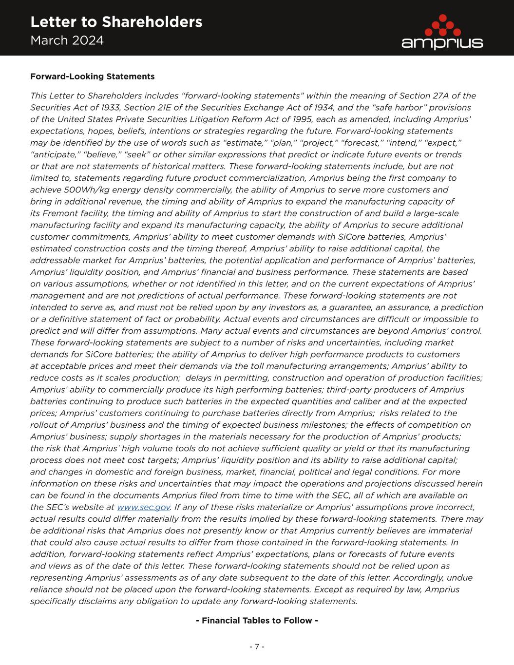 Letter to Shareholders March 2024 - 7 - Forward-Looking Statements This Letter to Shareholders includes “forward-looking statements” within the meaning of Section 27A of the Securities Act of 1933, Section 21E of the Securities Exchange Act of 1934, and the “safe harbor” provisions of the United States Private Securities Litigation Reform Act of 1995, each as amended, including Amprius’ expectations, hopes, beliefs, intentions or strategies regarding the future. Forward-looking statements may be identified by the use of words such as “estimate,” “plan,” “project,” “forecast,” “intend,” “expect,” “anticipate,” “believe,” “seek” or other similar expressions that predict or indicate future events or trends or that are not statements of historical matters. These forward-looking statements include, but are not limited to, statements regarding future product commercialization, Amprius being the first company to achieve 500Wh/kg energy density commercially, the ability of Amprius to serve more customers and bring in additional revenue, the timing and ability of Amprius to expand the manufacturing capacity of its Fremont facility, the timing and ability of Amprius to start the construction of and build a large-scale manufacturing facility and expand its manufacturing capacity, the ability of Amprius to secure additional customer commitments, Amprius’ ability to meet customer demands with SiCore batteries, Amprius’ estimated construction costs and the timing thereof, Amprius’ ability to raise additional capital, the addressable market for Amprius’ batteries, the potential application and performance of Amprius’ batteries, Amprius’ liquidity position, and Amprius’ financial and business performance. These statements are based on various assumptions, whether or not identified in this letter, and on the current expectations of Amprius’ management and are not predictions of actual performance. These forward-looking statements are not intended to serve as, and must not be relied upon by any investors as, a guarantee, an assurance, a prediction or a definitive statement of fact or probability. Actual events and circumstances are difficult or impossible to predict and will differ from assumptions. Many actual events and circumstances are beyond Amprius’ control. These forward-looking statements are subject to a number of risks and uncertainties, including market demands for SiCore batteries; the ability of Amprius to deliver high performance products to customers at acceptable prices and meet their demands via the toll manufacturing arrangements; Amprius’ ability to reduce costs as it scales production; delays in permitting, construction and operation of production facilities; Amprius’ ability to commercially produce its high performing batteries; third-party producers of Amprius batteries continuing to produce such batteries in the expected quantities and caliber and at the expected prices; Amprius’ customers continuing to purchase batteries directly from Amprius; risks related to the rollout of Amprius’ business and the timing of expected business milestones; the effects of competition on Amprius’ business; supply shortages in the materials necessary for the production of Amprius’ products; the risk that Amprius’ high volume tools do not achieve sufficient quality or yield or that its manufacturing process does not meet cost targets; Amprius’ liquidity position and its ability to raise additional capital; and changes in domestic and foreign business, market, financial, political and legal conditions. For more information on these risks and uncertainties that may impact the operations and projections discussed herein can be found in the documents Amprius filed from time to time with the SEC, all of which are available on the SEC’s website at www.sec.gov. If any of these risks materialize or Amprius’ assumptions prove incorrect, actual results could differ materially from the results implied by these forward-looking statements. There may be additional risks that Amprius does not presently know or that Amprius currently believes are immaterial that could also cause actual results to differ from those contained in the forward-looking statements. In addition, forward-looking statements reflect Amprius’ expectations, plans or forecasts of future events and views as of the date of this letter. These forward-looking statements should not be relied upon as representing Amprius’ assessments as of any date subsequent to the date of this letter. Accordingly, undue reliance should not be placed upon the forward-looking statements. Except as required by law, Amprius specifically disclaims any obligation to update any forward-looking statements. - Financial Tables to Follow -