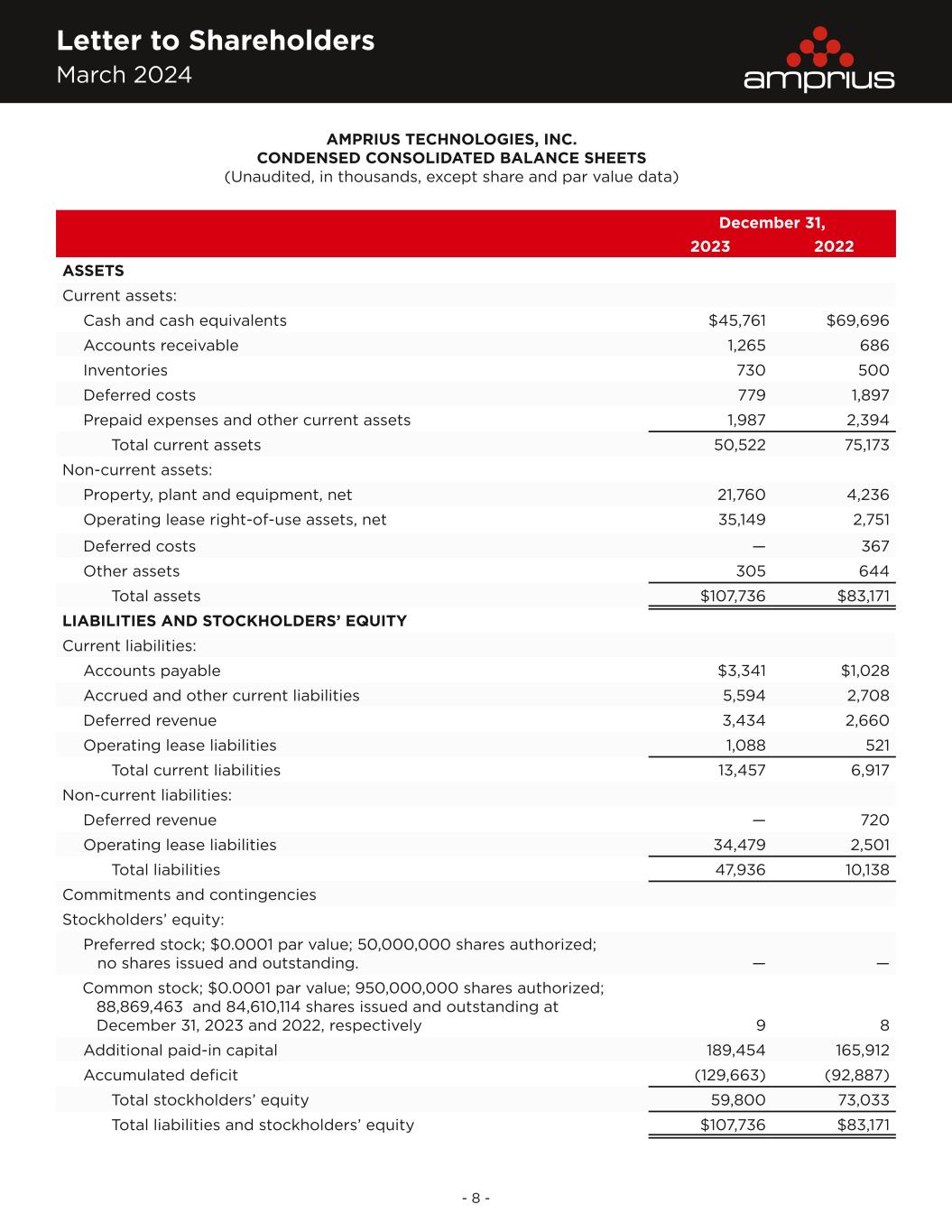 Letter to Shareholders March 2024 - 8 - AMPRIUS TECHNOLOGIES, INC. CONDENSED CONSOLIDATED BALANCE SHEETS (Unaudited, in thousands, except share and par value data) December 31, 2023 2022 ASSETS Current assets: Cash and cash equivalents $45,761 $69,696 Accounts receivable 1,265 686 Inventories 730 500 Deferred costs 779 1,897 Prepaid expenses and other current assets 1,987 2,394 Total current assets 50,522 75,173 Non-current assets: Property, plant and equipment, net 21,760 4,236 Operating lease right-of-use assets, net 35,149 2,751 Deferred costs — 367 Other assets 305 644 Total assets $107,736 $83,171 LIABILITIES AND STOCKHOLDERS’ EQUITY Current liabilities: Accounts payable $3,341 $1,028 Accrued and other current liabilities 5,594 2,708 Deferred revenue 3,434 2,660 Operating lease liabilities 1,088 521 Total current liabilities 13,457 6,917 Non-current liabilities: Deferred revenue — 720 Operating lease liabilities 34,479 2,501 Total liabilities 47,936 10,138 Commitments and contingencies Stockholders’ equity: Preferred stock; $0.0001 par value; 50,000,000 shares authorized; no shares issued and outstanding. — — Common stock; $0.0001 par value; 950,000,000 shares authorized; 88,869,463 and 84,610,114 shares issued and outstanding at December 31, 2023 and 2022, respectively 9 8 Additional paid-in capital 189,454 165,912 Accumulated deficit (129,663) (92,887) Total stockholders’ equity 59,800 73,033 Total liabilities and stockholders’ equity $107,736 $83,171