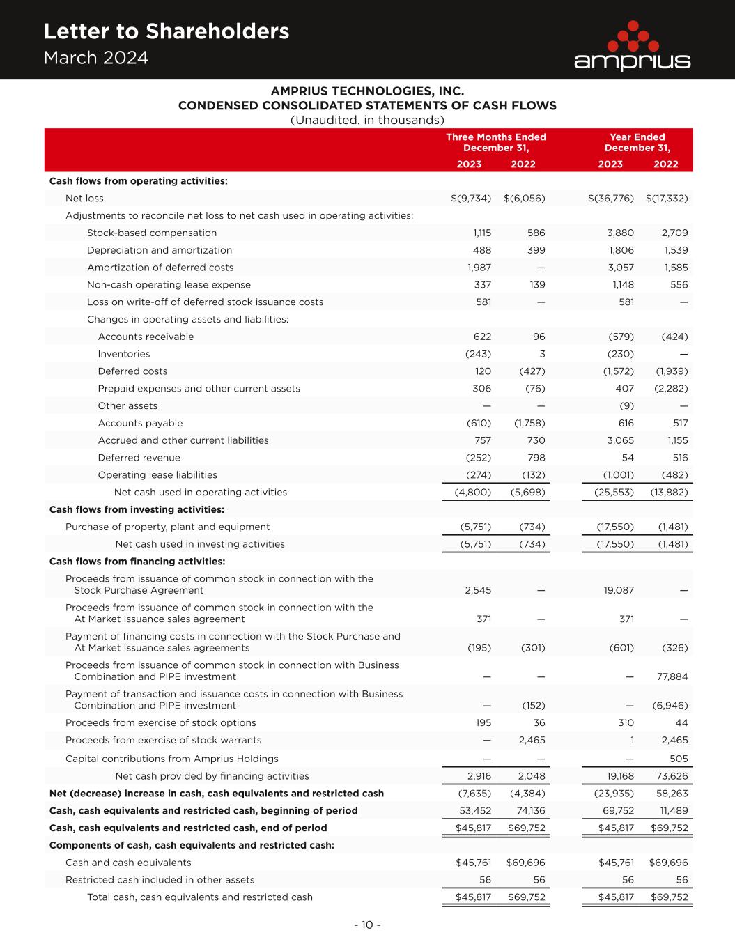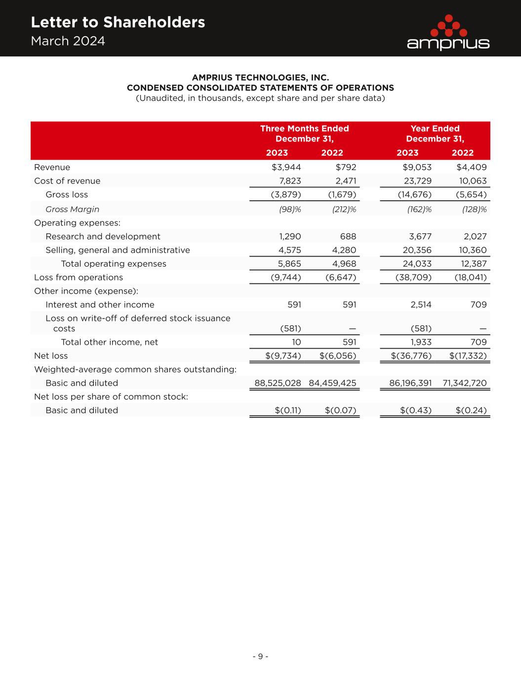 Letter to Shareholders March 2024 - 9 - AMPRIUS TECHNOLOGIES, INC. CONDENSED CONSOLIDATED STATEMENTS OF OPERATIONS (Unaudited, in thousands, except share and per share data) Three Months Ended December 31, Year Ended December 31, 2023 2022 2023 2022 Revenue $3,944 $792 $9,053 $4,409 Cost of revenue 7,823 2,471 23,729 10,063 Gross loss (3,879) (1,679) (14,676) (5,654) Gross Margin (98)% (212)% (162)% (128)% Operating expenses: Research and development 1,290 688 3,677 2,027 Selling, general and administrative 4,575 4,280 20,356 10,360 Total operating expenses 5,865 4,968 24,033 12,387 Loss from operations (9,744) (6,647) (38,709) (18,041) Other income (expense): Interest and other income 591 591 2,514 709 Loss on write-off of deferred stock issuance costs (581) — (581) — Total other income, net 10 591 1,933 709 Net loss $(9,734) $(6,056) $(36,776) $(17,332) Weighted-average common shares outstanding: Basic and diluted 88,525,028 84,459,425 86,196,391 71,342,720 Net loss per share of common stock: Basic and diluted $(0.11) $(0.07) $(0.43) $(0.24)