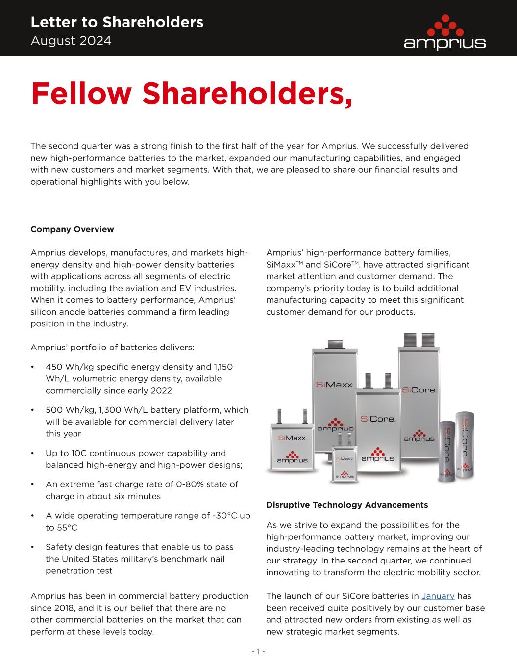 Letter to Shareholders August 2024 - 1 - Amprius’ high-performance battery families, SiMaxxTM and SiCoreTM, have attracted significant market attention and customer demand. The company’s priority today is to build additional manufacturing capacity to meet this significant customer demand for our products. Disruptive Technology Advancements As we strive to expand the possibilities for the high-performance battery market, improving our industry-leading technology remains at the heart of our strategy. In the second quarter, we continued innovating to transform the electric mobility sector. The launch of our SiCore batteries in January has been received quite positively by our customer base and attracted new orders from existing as well as new strategic market segments. Company Overview Amprius develops, manufactures, and markets high- energy density and high-power density batteries with applications across all segments of electric mobility, including the aviation and EV industries. When it comes to battery performance, Amprius’ silicon anode batteries command a firm leading position in the industry. Amprius’ portfolio of batteries delivers: • 450 Wh/kg specific energy density and 1,150 Wh/L volumetric energy density, available commercially since early 2022 • 500 Wh/kg, 1,300 Wh/L battery platform, which will be available for commercial delivery later this year • Up to 10C continuous power capability and balanced high-energy and high-power designs; • An extreme fast charge rate of 0-80% state of charge in about six minutes • A wide operating temperature range of -30°C up to 55°C • Safety design features that enable us to pass the United States military’s benchmark nail penetration test Amprius has been in commercial battery production since 2018, and it is our belief that there are no other commercial batteries on the market that can perform at these levels today. Fellow Shareholders, The second quarter was a strong finish to the first half of the year for Amprius. We successfully delivered new high-performance batteries to the market, expanded our manufacturing capabilities, and engaged with new customers and market segments. With that, we are pleased to share our financial results and operational highlights with you below.
