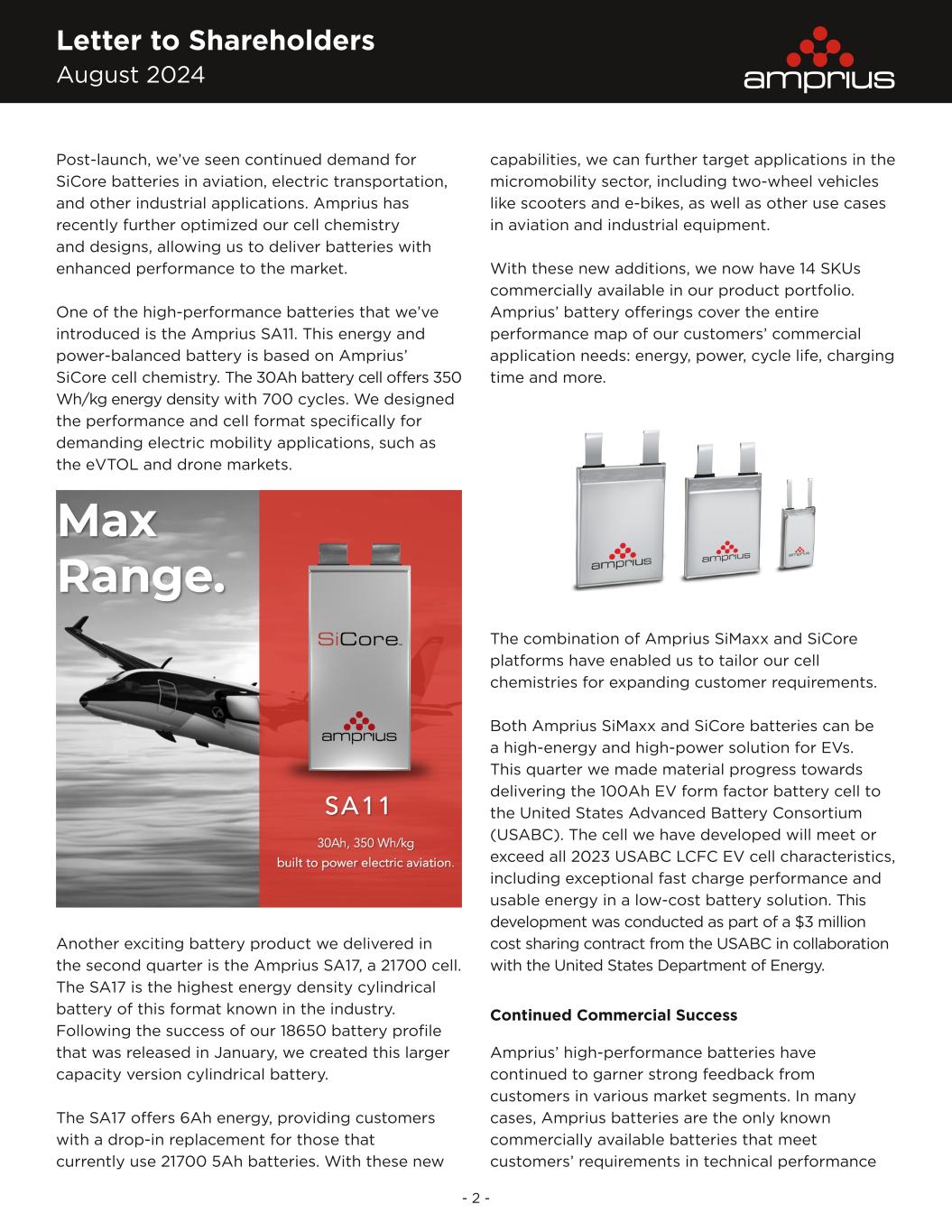 Letter to Shareholders August 2024 - 2 - Post-launch, we’ve seen continued demand for SiCore batteries in aviation, electric transportation, and other industrial applications. Amprius has recently further optimized our cell chemistry and designs, allowing us to deliver batteries with enhanced performance to the market. One of the high-performance batteries that we’ve introduced is the Amprius SA11. This energy and power-balanced battery is based on Amprius’ SiCore cell chemistry. The 30Ah battery cell offers 350 Wh/kg energy density with 700 cycles. We designed the performance and cell format specifically for demanding electric mobility applications, such as the eVTOL and drone markets. Another exciting battery product we delivered in the second quarter is the Amprius SA17, a 21700 cell. The SA17 is the highest energy density cylindrical battery of this format known in the industry. Following the success of our 18650 battery profile that was released in January, we created this larger capacity version cylindrical battery. The SA17 offers 6Ah energy, providing customers with a drop-in replacement for those that currently use 21700 5Ah batteries. With these new capabilities, we can further target applications in the micromobility sector, including two-wheel vehicles like scooters and e-bikes, as well as other use cases in aviation and industrial equipment. With these new additions, we now have 14 SKUs commercially available in our product portfolio. Amprius’ battery offerings cover the entire performance map of our customers’ commercial application needs: energy, power, cycle life, charging time and more. The combination of Amprius SiMaxx and SiCore platforms have enabled us to tailor our cell chemistries for expanding customer requirements. Both Amprius SiMaxx and SiCore batteries can be a high-energy and high-power solution for EVs. This quarter we made material progress towards delivering the 100Ah EV form factor battery cell to the United States Advanced Battery Consortium (USABC). The cell we have developed will meet or exceed all 2023 USABC LCFC EV cell characteristics, including exceptional fast charge performance and usable energy in a low-cost battery solution. This development was conducted as part of a $3 million cost sharing contract from the USABC in collaboration with the United States Department of Energy. Continued Commercial Success Amprius’ high-performance batteries have continued to garner strong feedback from customers in various market segments. In many cases, Amprius batteries are the only known commercially available batteries that meet customers’ requirements in technical performance