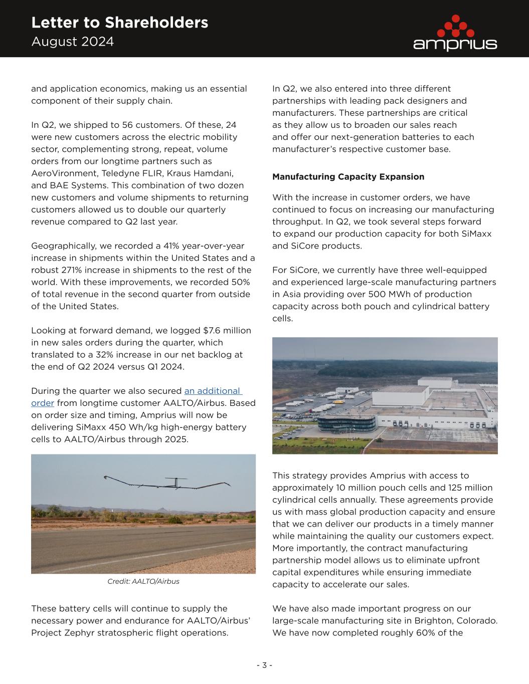 Letter to Shareholders August 2024 - 3 - and application economics, making us an essential component of their supply chain. In Q2, we shipped to 56 customers. Of these, 24 were new customers across the electric mobility sector, complementing strong, repeat, volume orders from our longtime partners such as AeroVironment, Teledyne FLIR, Kraus Hamdani, and BAE Systems. This combination of two dozen new customers and volume shipments to returning customers allowed us to double our quarterly revenue compared to Q2 last year. Geographically, we recorded a 41% year-over-year increase in shipments within the United States and a robust 271% increase in shipments to the rest of the world. With these improvements, we recorded 50% of total revenue in the second quarter from outside of the United States. Looking at forward demand, we logged $7.6 million in new sales orders during the quarter, which translated to a 32% increase in our net backlog at the end of Q2 2024 versus Q1 2024. During the quarter we also secured an additional order from longtime customer AALTO/Airbus. Based on order size and timing, Amprius will now be delivering SiMaxx 450 Wh/kg high-energy battery cells to AALTO/Airbus through 2025. These battery cells will continue to supply the necessary power and endurance for AALTO/Airbus’ Project Zephyr stratospheric flight operations. In Q2, we also entered into three different partnerships with leading pack designers and manufacturers. These partnerships are critical as they allow us to broaden our sales reach and offer our next-generation batteries to each manufacturer’s respective customer base. Manufacturing Capacity Expansion With the increase in customer orders, we have continued to focus on increasing our manufacturing throughput. In Q2, we took several steps forward to expand our production capacity for both SiMaxx and SiCore products. For SiCore, we currently have three well-equipped and experienced large-scale manufacturing partners in Asia providing over 500 MWh of production capacity across both pouch and cylindrical battery cells. This strategy provides Amprius with access to approximately 10 million pouch cells and 125 million cylindrical cells annually. These agreements provide us with mass global production capacity and ensure that we can deliver our products in a timely manner while maintaining the quality our customers expect. More importantly, the contract manufacturing partnership model allows us to eliminate upfront capital expenditures while ensuring immediate capacity to accelerate our sales. We have also made important progress on our large-scale manufacturing site in Brighton, Colorado. We have now completed roughly 60% of the Credit: AALTO/Airbus