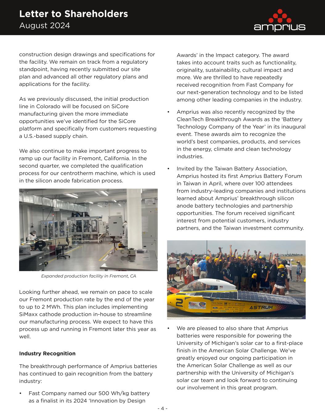 Letter to Shareholders August 2024 - 4 - construction design drawings and specifications for the facility. We remain on track from a regulatory standpoint, having recently submitted our site plan and advanced all other regulatory plans and applications for the facility. As we previously discussed, the initial production line in Colorado will be focused on SiCore manufacturing given the more immediate opportunities we’ve identified for the SiCore platform and specifically from customers requesting a U.S.-based supply chain. We also continue to make important progress to ramp up our facility in Fremont, California. In the second quarter, we completed the qualification process for our centrotherm machine, which is used in the silicon anode fabrication process. Looking further ahead, we remain on pace to scale our Fremont production rate by the end of the year to up to 2 MWh. This plan includes implementing SiMaxx cathode production in-house to streamline our manufacturing process. We expect to have this process up and running in Fremont later this year as well. Industry Recognition The breakthrough performance of Amprius batteries has continued to gain recognition from the battery industry: • Fast Company named our 500 Wh/kg battery as a finalist in its 2024 ‘Innovation by Design Awards’ in the Impact category. The award takes into account traits such as functionality, originality, sustainability, cultural impact and more. We are thrilled to have repeatedly received recognition from Fast Company for our next-generation technology and to be listed among other leading companies in the industry. • Amprius was also recently recognized by the CleanTech Breakthrough Awards as the ‘Battery Technology Company of the Year’ in its inaugural event. These awards aim to recognize the world’s best companies, products, and services in the energy, climate and clean technology industries. • Invited by the Taiwan Battery Association, Amprius hosted its first Amprius Battery Forum in Taiwan in April, where over 100 attendees from industry-leading companies and institutions learned about Amprius’ breakthrough silicon anode battery technologies and partnership opportunities. The forum received significant interest from potential customers, industry partners, and the Taiwan investment community. • We are pleased to also share that Amprius batteries were responsible for powering the University of Michigan’s solar car to a first-place finish in the American Solar Challenge. We’ve greatly enjoyed our ongoing participation in the American Solar Challenge as well as our partnership with the University of Michigan’s solar car team and look forward to continuing our involvement in this great program. Expanded production facility in Fremont, CA