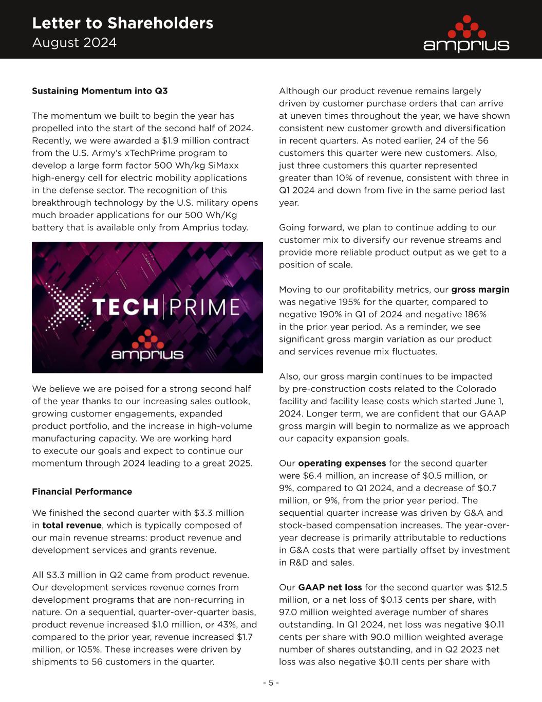 Letter to Shareholders August 2024 - 5 - Sustaining Momentum into Q3 The momentum we built to begin the year has propelled into the start of the second half of 2024. Recently, we were awarded a $1.9 million contract from the U.S. Army’s xTechPrime program to develop a large form factor 500 Wh/kg SiMaxx high-energy cell for electric mobility applications in the defense sector. The recognition of this breakthrough technology by the U.S. military opens much broader applications for our 500 Wh/Kg battery that is available only from Amprius today. We believe we are poised for a strong second half of the year thanks to our increasing sales outlook, growing customer engagements, expanded product portfolio, and the increase in high-volume manufacturing capacity. We are working hard to execute our goals and expect to continue our momentum through 2024 leading to a great 2025. Financial Performance We finished the second quarter with $3.3 million in total revenue, which is typically composed of our main revenue streams: product revenue and development services and grants revenue. All $3.3 million in Q2 came from product revenue. Our development services revenue comes from development programs that are non-recurring in nature. On a sequential, quarter-over-quarter basis, product revenue increased $1.0 million, or 43%, and compared to the prior year, revenue increased $1.7 million, or 105%. These increases were driven by shipments to 56 customers in the quarter. Although our product revenue remains largely driven by customer purchase orders that can arrive at uneven times throughout the year, we have shown consistent new customer growth and diversification in recent quarters. As noted earlier, 24 of the 56 customers this quarter were new customers. Also, just three customers this quarter represented greater than 10% of revenue, consistent with three in Q1 2024 and down from five in the same period last year. Going forward, we plan to continue adding to our customer mix to diversify our revenue streams and provide more reliable product output as we get to a position of scale. Moving to our profitability metrics, our gross margin was negative 195% for the quarter, compared to negative 190% in Q1 of 2024 and negative 186% in the prior year period. As a reminder, we see significant gross margin variation as our product and services revenue mix fluctuates. Also, our gross margin continues to be impacted by pre-construction costs related to the Colorado facility and facility lease costs which started June 1, 2024. Longer term, we are confident that our GAAP gross margin will begin to normalize as we approach our capacity expansion goals. Our operating expenses for the second quarter were $6.4 million, an increase of $0.5 million, or 9%, compared to Q1 2024, and a decrease of $0.7 million, or 9%, from the prior year period. The sequential quarter increase was driven by G&A and stock-based compensation increases. The year-over- year decrease is primarily attributable to reductions in G&A costs that were partially offset by investment in R&D and sales. Our GAAP net loss for the second quarter was $12.5 million, or a net loss of $0.13 cents per share, with 97.0 million weighted average number of shares outstanding. In Q1 2024, net loss was negative $0.11 cents per share with 90.0 million weighted average number of shares outstanding, and in Q2 2023 net loss was also negative $0.11 cents per share with