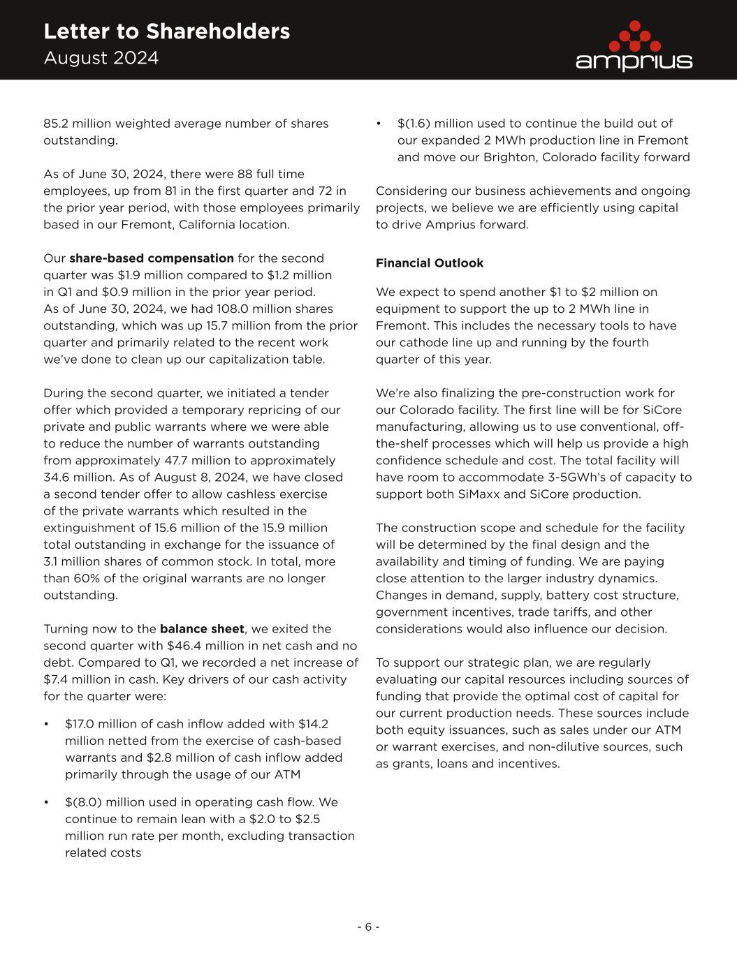 Letter to Shareholders August 2024 - 6 - 85.2 million weighted average number of shares outstanding. As of June 30, 2024, there were 88 full time employees, up from 81 in the first quarter and 72 in the prior year period, with those employees primarily based in our Fremont, California location. Our share-based compensation for the second quarter was $1.9 million compared to $1.2 million in Q1 and $0.9 million in the prior year period. As of June 30, 2024, we had 108.0 million shares outstanding, which was up 15.7 million from the prior quarter and primarily related to the recent work we’ve done to clean up our capitalization table. During the second quarter, we initiated a tender offer which provided a temporary repricing of our private and public warrants where we were able to reduce the number of warrants outstanding from approximately 47.7 million to approximately 34.6 million. As of August 8, 2024, we have closed a second tender offer to allow cashless exercise of the private warrants which resulted in the extinguishment of 15.6 million of the 15.9 million total outstanding in exchange for the issuance of 3.1 million shares of common stock. In total, more than 60% of the original warrants are no longer outstanding. Turning now to the balance sheet, we exited the second quarter with $46.4 million in net cash and no debt. Compared to Q1, we recorded a net increase of $7.4 million in cash. Key drivers of our cash activity for the quarter were: • $17.0 million of cash inflow added with $14.2 million netted from the exercise of cash-based warrants and $2.8 million of cash inflow added primarily through the usage of our ATM • $(8.0) million used in operating cash flow. We continue to remain lean with a $2.0 to $2.5 million run rate per month, excluding transaction related costs • $(1.6) million used to continue the build out of our expanded 2 MWh production line in Fremont and move our Brighton, Colorado facility forward Considering our business achievements and ongoing projects, we believe we are efficiently using capital to drive Amprius forward. Financial Outlook We expect to spend another $1 to $2 million on equipment to support the up to 2 MWh line in Fremont. This includes the necessary tools to have our cathode line up and running by the fourth quarter of this year. We’re also finalizing the pre-construction work for our Colorado facility. The first line will be for SiCore manufacturing, allowing us to use conventional, off- the-shelf processes which will help us provide a high confidence schedule and cost. The total facility will have room to accommodate 3-5GWh’s of capacity to support both SiMaxx and SiCore production. The construction scope and schedule for the facility will be determined by the final design and the availability and timing of funding. We are paying close attention to the larger industry dynamics. Changes in demand, supply, battery cost structure, government incentives, trade tariffs, and other considerations would also influence our decision. To support our strategic plan, we are regularly evaluating our capital resources including sources of funding that provide the optimal cost of capital for our current production needs. These sources include both equity issuances, such as sales under our ATM or warrant exercises, and non-dilutive sources, such as grants, loans and incentives.