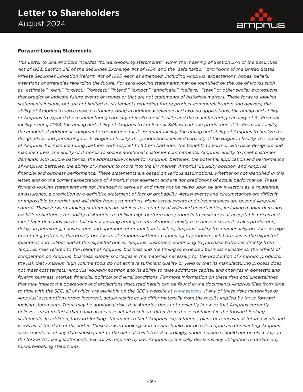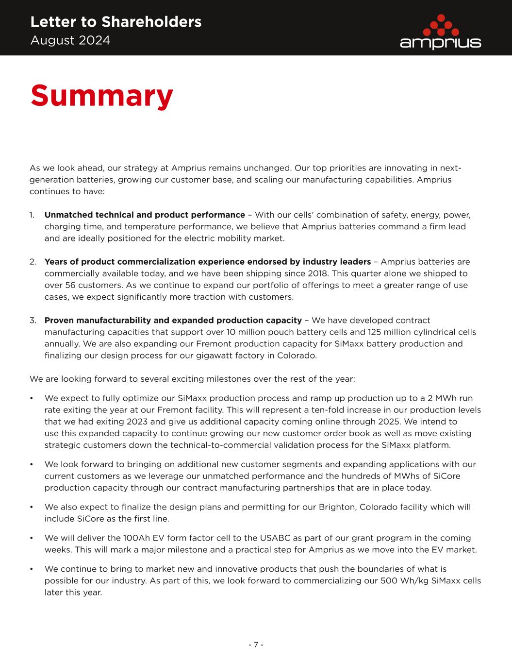 Letter to Shareholders August 2024 - 7 - Summary As we look ahead, our strategy at Amprius remains unchanged. Our top priorities are innovating in next- generation batteries, growing our customer base, and scaling our manufacturing capabilities. Amprius continues to have: 1. Unmatched technical and product performance – With our cells’ combination of safety, energy, power, charging time, and temperature performance, we believe that Amprius batteries command a firm lead and are ideally positioned for the electric mobility market. 2. Years of product commercialization experience endorsed by industry leaders – Amprius batteries are commercially available today, and we have been shipping since 2018. This quarter alone we shipped to over 56 customers. As we continue to expand our portfolio of offerings to meet a greater range of use cases, we expect significantly more traction with customers. 3. Proven manufacturability and expanded production capacity – We have developed contract manufacturing capacities that support over 10 million pouch battery cells and 125 million cylindrical cells annually. We are also expanding our Fremont production capacity for SiMaxx battery production and finalizing our design process for our gigawatt factory in Colorado. We are looking forward to several exciting milestones over the rest of the year: • We expect to fully optimize our SiMaxx production process and ramp up production up to a 2 MWh run rate exiting the year at our Fremont facility. This will represent a ten-fold increase in our production levels that we had exiting 2023 and give us additional capacity coming online through 2025. We intend to use this expanded capacity to continue growing our new customer order book as well as move existing strategic customers down the technical-to-commercial validation process for the SiMaxx platform. • We look forward to bringing on additional new customer segments and expanding applications with our current customers as we leverage our unmatched performance and the hundreds of MWhs of SiCore production capacity through our contract manufacturing partnerships that are in place today. • We also expect to finalize the design plans and permitting for our Brighton, Colorado facility which will include SiCore as the first line. • We will deliver the 100Ah EV form factor cell to the USABC as part of our grant program in the coming weeks. This will mark a major milestone and a practical step for Amprius as we move into the EV market. • We continue to bring to market new and innovative products that push the boundaries of what is possible for our industry. As part of this, we look forward to commercializing our 500 Wh/kg SiMaxx cells later this year.