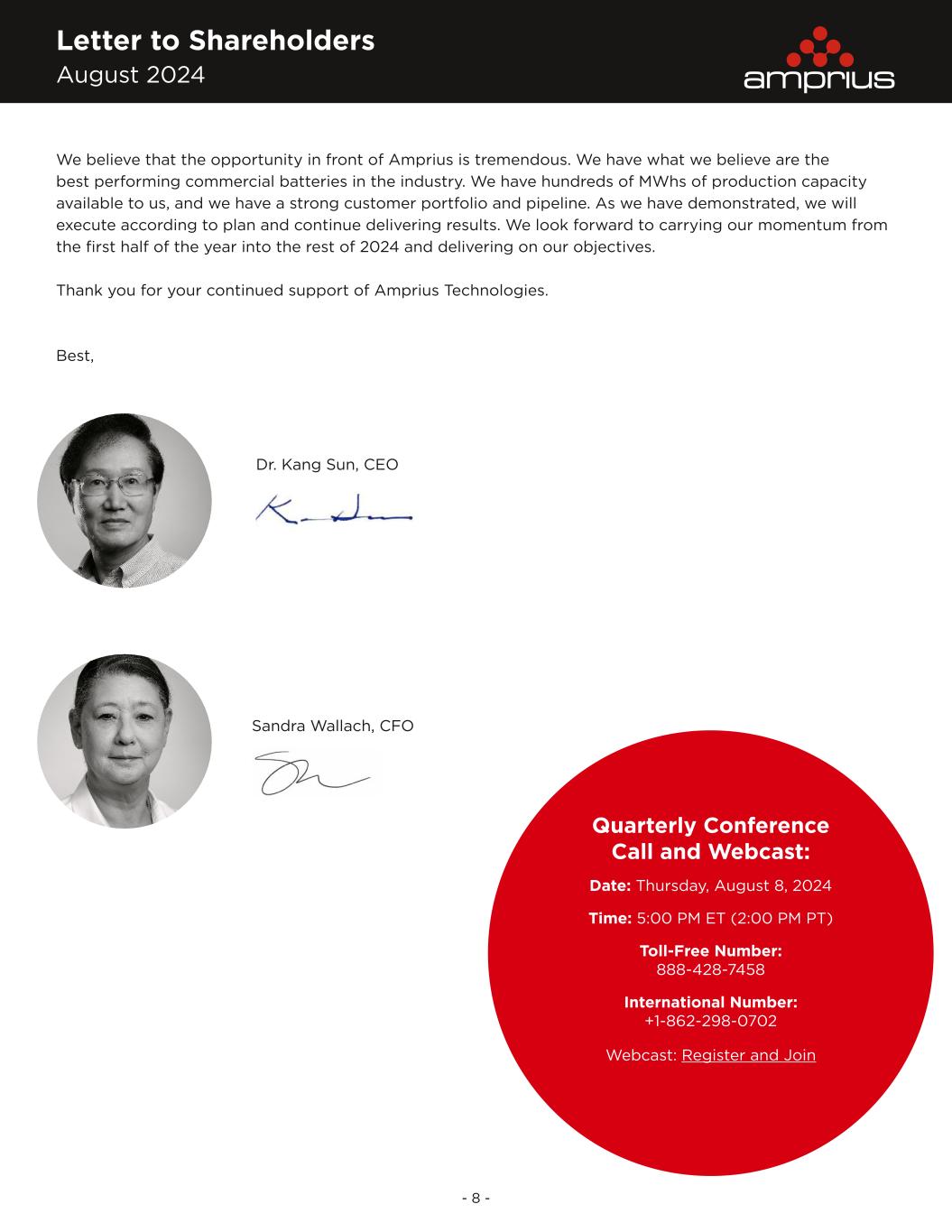 Letter to Shareholders August 2024 - 8 - Quarterly Conference Call and Webcast: Date: Thursday, August 8, 2024 Time: 5:00 PM ET (2:00 PM PT) Toll-Free Number: 888-428-7458 International Number: +1-862-298-0702 Webcast: Register and Join Dr. Kang Sun, CEO Sandra Wallach, CFO We believe that the opportunity in front of Amprius is tremendous. We have what we believe are the best performing commercial batteries in the industry. We have hundreds of MWhs of production capacity available to us, and we have a strong customer portfolio and pipeline. As we have demonstrated, we will execute according to plan and continue delivering results. We look forward to carrying our momentum from the first half of the year into the rest of 2024 and delivering on our objectives. Thank you for your continued support of Amprius Technologies. Best,