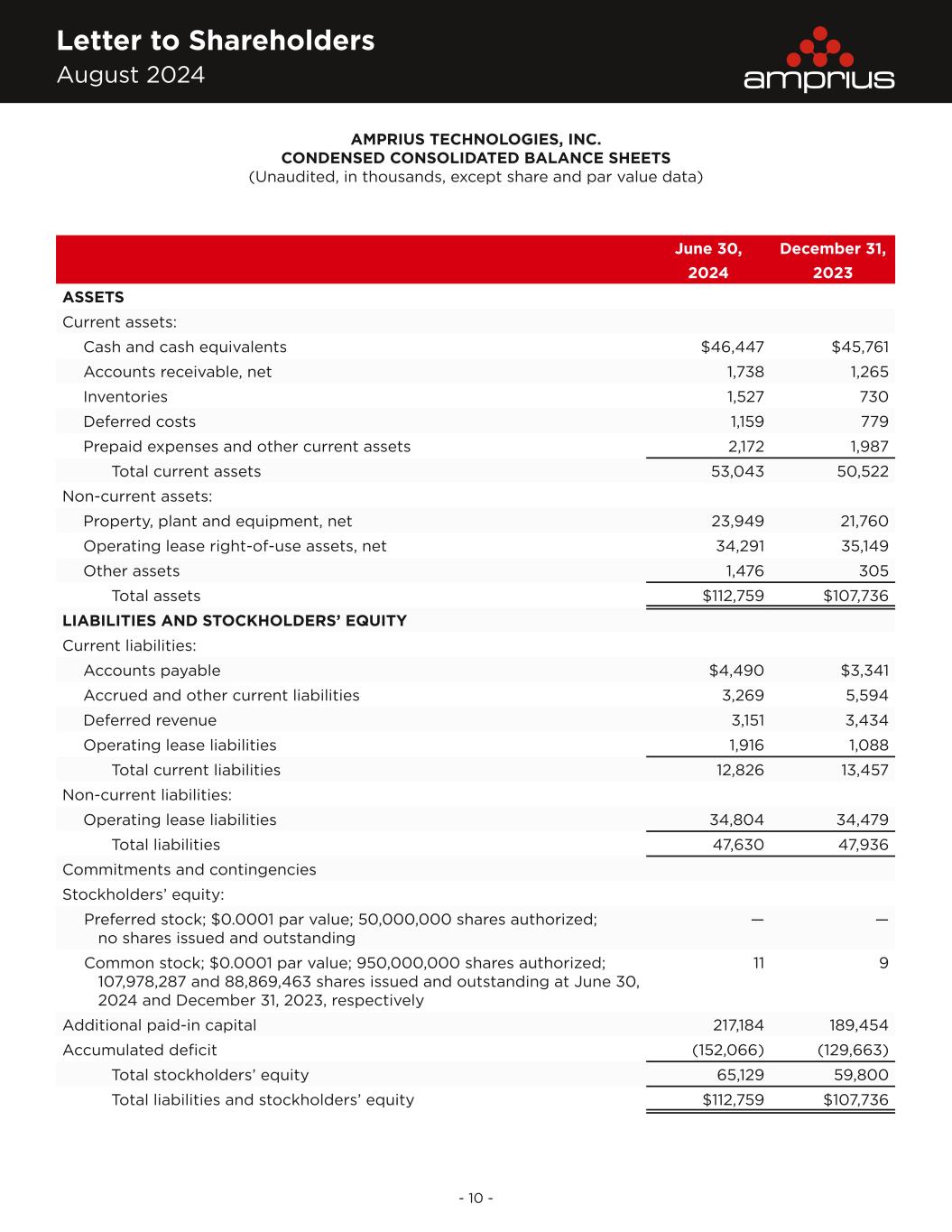 Letter to Shareholders August 2024 - 10 - AMPRIUS TECHNOLOGIES, INC. CONDENSED CONSOLIDATED BALANCE SHEETS (Unaudited, in thousands, except share and par value data) June 30, December 31, 2024 2023 ASSETS Current assets: Cash and cash equivalents $46,447 $45,761 Accounts receivable, net 1,738 1,265 Inventories 1,527 730 Deferred costs 1,159 779 Prepaid expenses and other current assets 2,172 1,987 Total current assets 53,043 50,522 Non-current assets: Property, plant and equipment, net 23,949 21,760 Operating lease right-of-use assets, net 34,291 35,149 Other assets 1,476 305 Total assets $112,759 $107,736 LIABILITIES AND STOCKHOLDERS’ EQUITY Current liabilities: Accounts payable $4,490 $3,341 Accrued and other current liabilities 3,269 5,594 Deferred revenue 3,151 3,434 Operating lease liabilities 1,916 1,088 Total current liabilities 12,826 13,457 Non-current liabilities: Operating lease liabilities 34,804 34,479 Total liabilities 47,630 47,936 Commitments and contingencies Stockholders’ equity: Preferred stock; $0.0001 par value; 50,000,000 shares authorized; no shares issued and outstanding — — Common stock; $0.0001 par value; 950,000,000 shares authorized; 107,978,287 and 88,869,463 shares issued and outstanding at June 30, 2024 and December 31, 2023, respectively 11 9 Additional paid-in capital 217,184 189,454 Accumulated deficit (152,066) (129,663) Total stockholders’ equity 65,129 59,800 Total liabilities and stockholders’ equity $112,759 $107,736