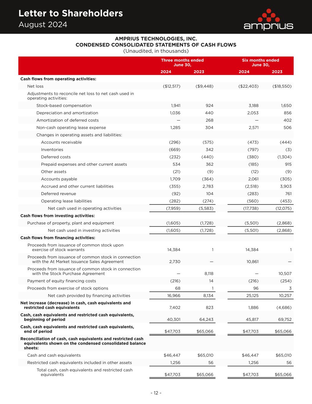 Letter to Shareholders August 2024 - 12 - AMPRIUS TECHNOLOGIES, INC. CONDENSED CONSOLIDATED STATEMENTS OF CASH FLOWS (Unaudited, in thousands) Three months ended June 30, Six months ended June 30, 2024 2023 2024 2023 Cash flows from operating activities: Net loss ($12,517) ($9,448) ($22,403) ($18,550) Adjustments to reconcile net loss to net cash used in operating activities: Stock-based compensation 1,941 924 3,188 1,650 Depreciation and amortization 1,036 440 2,053 856 Amortization of deferred costs — 268 — 402 Non-cash operating lease expense 1,285 304 2,571 506 Changes in operating assets and liabilities: Accounts receivable (296) (575) (473) (444) Inventories (669) 342 (797) (3) Deferred costs (232) (440) (380) (1,304) Prepaid expenses and other current assets 534 362 (185) 915 Other assets (21) (9) (12) (9) Accounts payable 1,709 (364) 2,061 (305) Accrued and other current liabilities (355) 2,783 (2,518) 3,903 Deferred revenue (92) 104 (283) 761 Operating lease liabilities (282) (274) (560) (453) Net cash used in operating activities (7,959) (5,583) (17,738) (12,075) Cash flows from investing activities: Purchase of property, plant and equipment (1,605) (1,728) (5,501) (2,868) Net cash used in investing activities (1,605) (1,728) (5,501) (2,868) Cash flows from financing activities: Proceeds from issuance of common stock upon exercise of stock warrants 14,384 1 14,384 1 Proceeds from issuance of common stock in connection with the At Market Issuance Sales Agreement 2,730 — 10,861 — Proceeds from issuance of common stock in connection with the Stock Purchase Agreement — 8,118 — 10,507 Payment of equity financing costs (216) 14 (216) (254) Proceeds from exercise of stock options 68 1 96 3 Net cash provided by financing activities 16,966 8,134 25,125 10,257 Net increase (decrease) in cash, cash equivalents and restricted cash equivalents 7,402 823 1,886 (4,686) Cash, cash equivalents and restricted cash equivalents, beginning of period 40,301 64,243 45,817 69,752 Cash, cash equivalents and restricted cash equivalents, end of period $47,703 $65,066 $47,703 $65,066 Reconciliation of cash, cash equivalents and restricted cash equivalents shown on the condensed consolidated balance sheets: Cash and cash equivalents $46,447 $65,010 $46,447 $65,010 Restricted cash equivalents included in other assets 1,256 56 1,256 56 Total cash, cash equivalents and restricted cash equivalents $47,703 $65,066 $47,703 $65,066