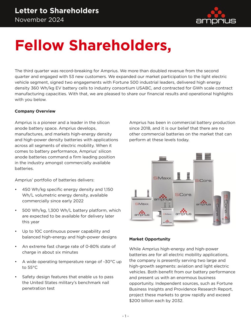 Letter to Shareholders November 2024 - 1 - Amprius has been in commercial battery production since 2018, and it is our belief that there are no other commercial batteries on the market that can perform at these levels today. Market Opportunity While Amprius high-energy and high-power batteries are for all electric mobility applications, the company is presently serving two large and high-growth segments: aviation and light electric vehicles. Both benefit from our battery performance and present us with an enormous business opportunity. Independent sources, such as Fortune Business Insights and Providence Research Report, project these markets to grow rapidly and exceed $200 billion each by 2032. Company Overview Amprius is a pioneer and a leader in the silicon anode battery space. Amprius develops, manufactures, and markets high-energy density and high-power density batteries with applications across all segments of electric mobility. When it comes to battery performance, Amprius’ silicon anode batteries command a firm leading position in the industry amongst commercially available batteries. Amprius’ portfolio of batteries delivers: • 450 Wh/kg specific energy density and 1,150 Wh/L volumetric energy density, available commercially since early 2022 • 500 Wh/kg, 1,300 Wh/L battery platform, which are expected to be available for delivery later this year • Up to 10C continuous power capability and balanced high-energy and high-power designs • An extreme fast charge rate of 0-80% state of charge in about six minutes • A wide operating temperature range of -30°C up to 55°C • Safety design features that enable us to pass the United States military’s benchmark nail penetration test Fellow Shareholders, The third quarter was record-breaking for Amprius. We more than doubled revenue from the second quarter and engaged with 53 new customers. We expanded our market participation to the light electric vehicle segment, signed two engagements with Fortune 500 industrial leaders, delivered high energy density 360 Wh/kg EV battery cells to industry consortium USABC, and contracted for GWh scale contract manufacturing capacities. With that, we are pleased to share our financial results and operational highlights with you below.