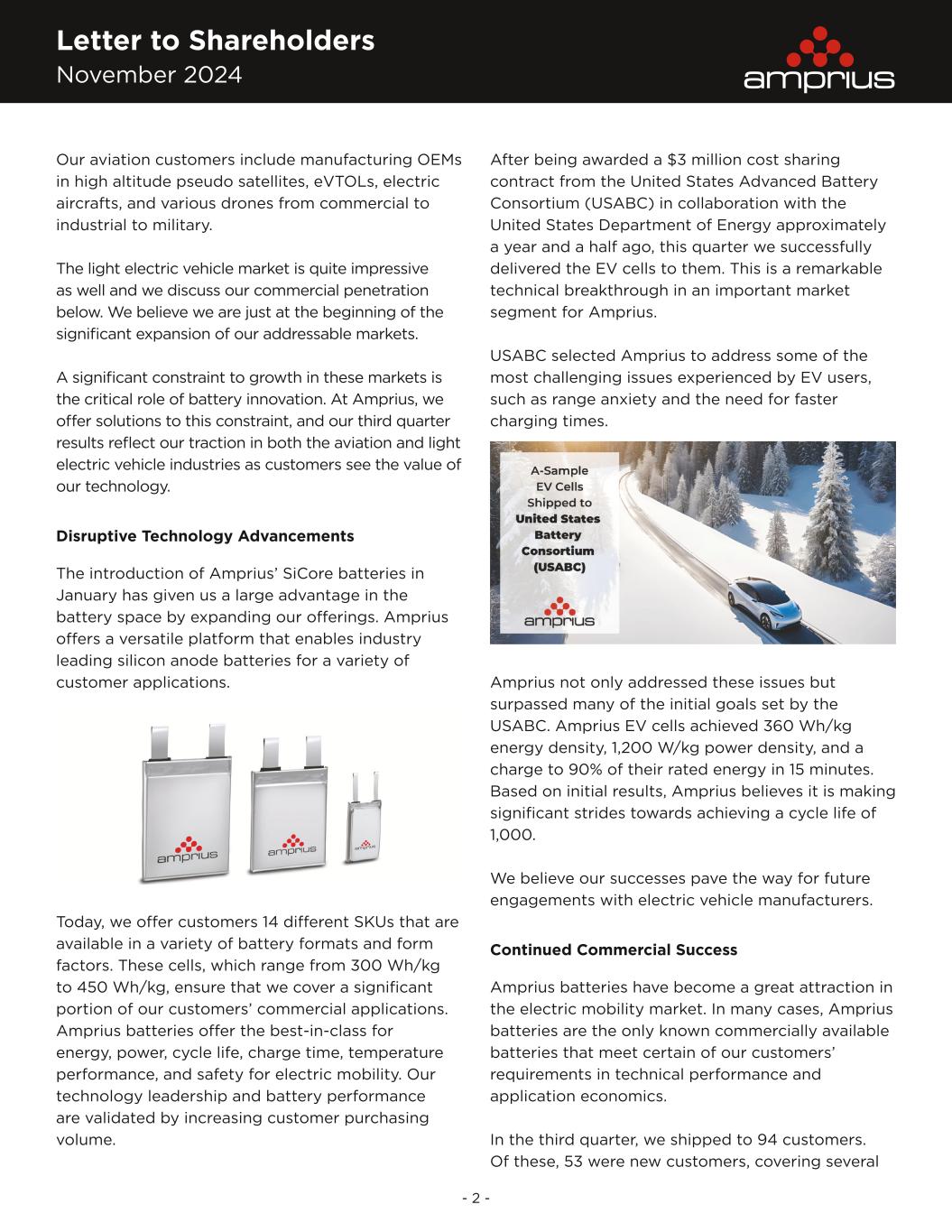 Letter to Shareholders November 2024 - 2 - Our aviation customers include manufacturing OEMs in high altitude pseudo satellites, eVTOLs, electric aircrafts, and various drones from commercial to industrial to military. The light electric vehicle market is quite impressive as well and we discuss our commercial penetration below. We believe we are just at the beginning of the significant expansion of our addressable markets. A significant constraint to growth in these markets is the critical role of battery innovation. At Amprius, we offer solutions to this constraint, and our third quarter results reflect our traction in both the aviation and light electric vehicle industries as customers see the value of our technology. Disruptive Technology Advancements The introduction of Amprius’ SiCore batteries in January has given us a large advantage in the battery space by expanding our offerings. Amprius offers a versatile platform that enables industry leading silicon anode batteries for a variety of customer applications. Today, we offer customers 14 different SKUs that are available in a variety of battery formats and form factors. These cells, which range from 300 Wh/kg to 450 Wh/kg, ensure that we cover a significant portion of our customers’ commercial applications. Amprius batteries offer the best-in-class for energy, power, cycle life, charge time, temperature performance, and safety for electric mobility. Our technology leadership and battery performance are validated by increasing customer purchasing volume. After being awarded a $3 million cost sharing contract from the United States Advanced Battery Consortium (USABC) in collaboration with the United States Department of Energy approximately a year and a half ago, this quarter we successfully delivered the EV cells to them. This is a remarkable technical breakthrough in an important market segment for Amprius. USABC selected Amprius to address some of the most challenging issues experienced by EV users, such as range anxiety and the need for faster charging times. Amprius not only addressed these issues but surpassed many of the initial goals set by the USABC. Amprius EV cells achieved 360 Wh/kg energy density, 1,200 W/kg power density, and a charge to 90% of their rated energy in 15 minutes. Based on initial results, Amprius believes it is making significant strides towards achieving a cycle life of 1,000. We believe our successes pave the way for future engagements with electric vehicle manufacturers. Continued Commercial Success Amprius batteries have become a great attraction in the electric mobility market. In many cases, Amprius batteries are the only known commercially available batteries that meet certain of our customers’ requirements in technical performance and application economics. In the third quarter, we shipped to 94 customers. Of these, 53 were new customers, covering several