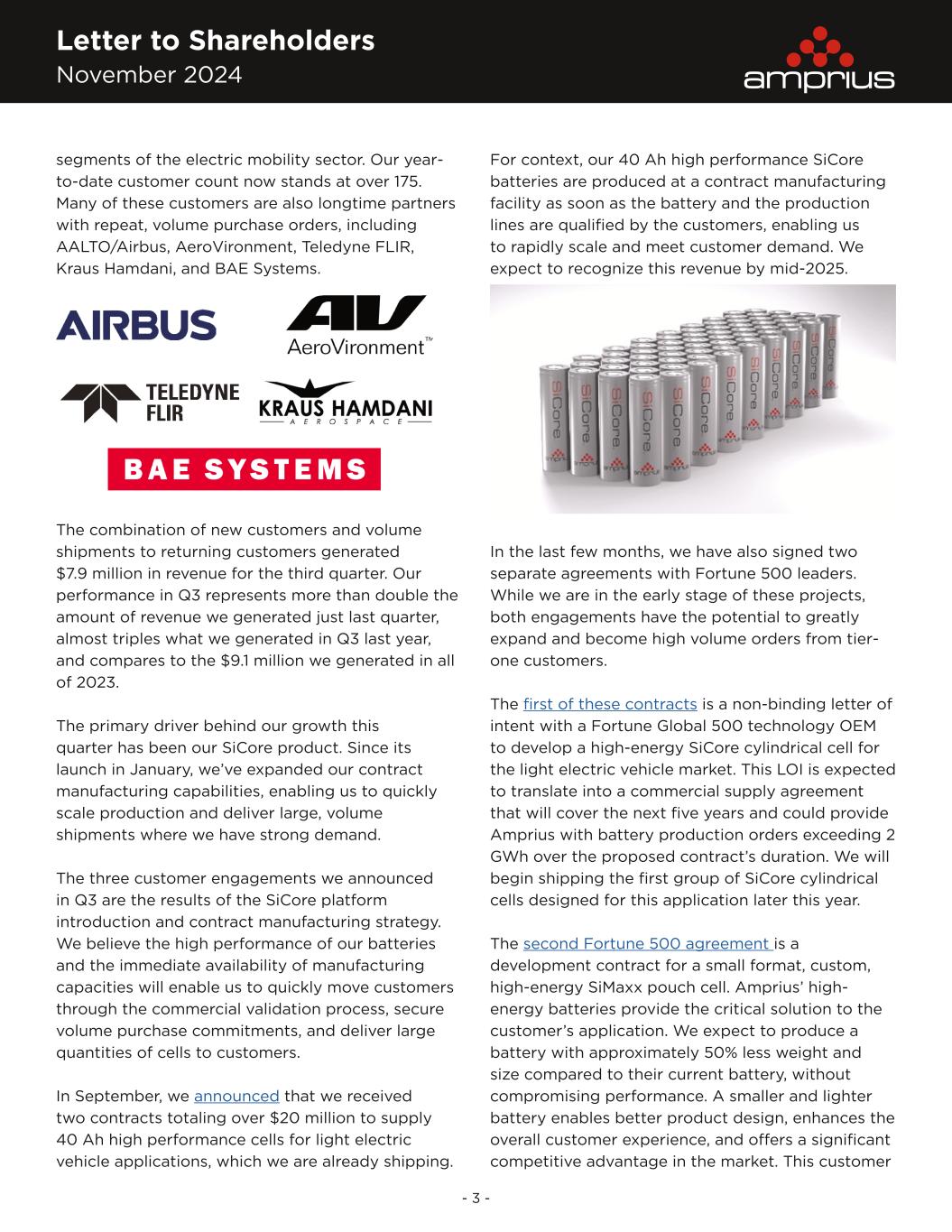 Letter to Shareholders November 2024 - 3 - segments of the electric mobility sector. Our year- to-date customer count now stands at over 175. Many of these customers are also longtime partners with repeat, volume purchase orders, including AALTO/Airbus, AeroVironment, Teledyne FLIR, Kraus Hamdani, and BAE Systems. The combination of new customers and volume shipments to returning customers generated $7.9 million in revenue for the third quarter. Our performance in Q3 represents more than double the amount of revenue we generated just last quarter, almost triples what we generated in Q3 last year, and compares to the $9.1 million we generated in all of 2023. The primary driver behind our growth this quarter has been our SiCore product. Since its launch in January, we’ve expanded our contract manufacturing capabilities, enabling us to quickly scale production and deliver large, volume shipments where we have strong demand. The three customer engagements we announced in Q3 are the results of the SiCore platform introduction and contract manufacturing strategy. We believe the high performance of our batteries and the immediate availability of manufacturing capacities will enable us to quickly move customers through the commercial validation process, secure volume purchase commitments, and deliver large quantities of cells to customers. In September, we announced that we received two contracts totaling over $20 million to supply 40 Ah high performance cells for light electric vehicle applications, which we are already shipping. For context, our 40 Ah high performance SiCore batteries are produced at a contract manufacturing facility as soon as the battery and the production lines are qualified by the customers, enabling us to rapidly scale and meet customer demand. We expect to recognize this revenue by mid-2025. In the last few months, we have also signed two separate agreements with Fortune 500 leaders. While we are in the early stage of these projects, both engagements have the potential to greatly expand and become high volume orders from tier- one customers. The first of these contracts is a non-binding letter of intent with a Fortune Global 500 technology OEM to develop a high-energy SiCore cylindrical cell for the light electric vehicle market. This LOI is expected to translate into a commercial supply agreement that will cover the next five years and could provide Amprius with battery production orders exceeding 2 GWh over the proposed contract’s duration. We will begin shipping the first group of SiCore cylindrical cells designed for this application later this year. The second Fortune 500 agreement is a development contract for a small format, custom, high-energy SiMaxx pouch cell. Amprius’ high- energy batteries provide the critical solution to the customer’s application. We expect to produce a battery with approximately 50% less weight and size compared to their current battery, without compromising performance. A smaller and lighter battery enables better product design, enhances the overall customer experience, and offers a significant competitive advantage in the market. This customer