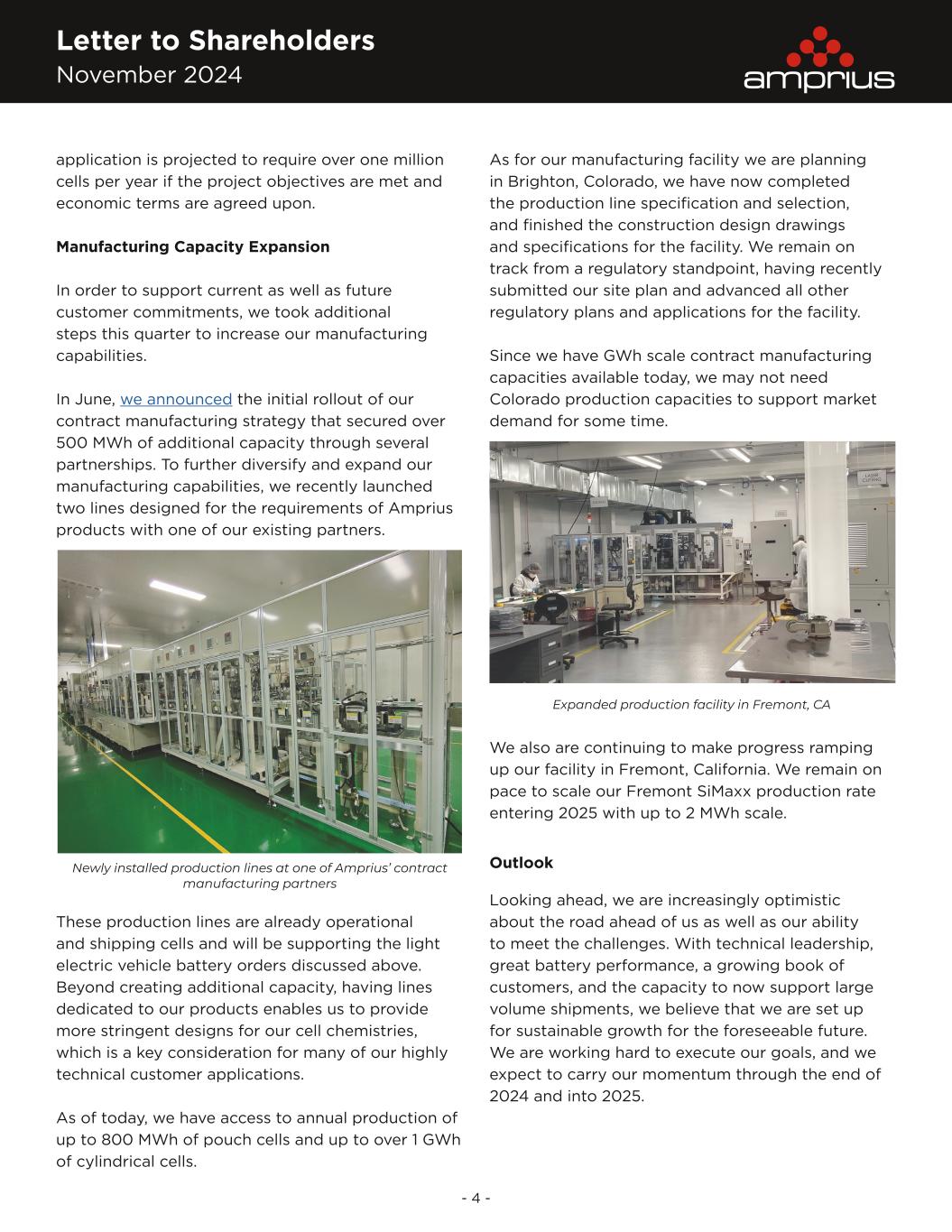 Letter to Shareholders November 2024 - 4 - application is projected to require over one million cells per year if the project objectives are met and economic terms are agreed upon. Manufacturing Capacity Expansion In order to support current as well as future customer commitments, we took additional steps this quarter to increase our manufacturing capabilities. In June, we announced the initial rollout of our contract manufacturing strategy that secured over 500 MWh of additional capacity through several partnerships. To further diversify and expand our manufacturing capabilities, we recently launched two lines designed for the requirements of Amprius products with one of our existing partners. These production lines are already operational and shipping cells and will be supporting the light electric vehicle battery orders discussed above. Beyond creating additional capacity, having lines dedicated to our products enables us to provide more stringent designs for our cell chemistries, which is a key consideration for many of our highly technical customer applications. As of today, we have access to annual production of up to 800 MWh of pouch cells and up to over 1 GWh of cylindrical cells. As for our manufacturing facility we are planning in Brighton, Colorado, we have now completed the production line specification and selection, and finished the construction design drawings and specifications for the facility. We remain on track from a regulatory standpoint, having recently submitted our site plan and advanced all other regulatory plans and applications for the facility. Since we have GWh scale contract manufacturing capacities available today, we may not need Colorado production capacities to support market demand for some time. We also are continuing to make progress ramping up our facility in Fremont, California. We remain on pace to scale our Fremont SiMaxx production rate entering 2025 with up to 2 MWh scale. Outlook Looking ahead, we are increasingly optimistic about the road ahead of us as well as our ability to meet the challenges. With technical leadership, great battery performance, a growing book of customers, and the capacity to now support large volume shipments, we believe that we are set up for sustainable growth for the foreseeable future. We are working hard to execute our goals, and we expect to carry our momentum through the end of 2024 and into 2025. Newly installed production lines at one of Amprius’ contract manufacturing partners Expanded production facility in Fremont, CA