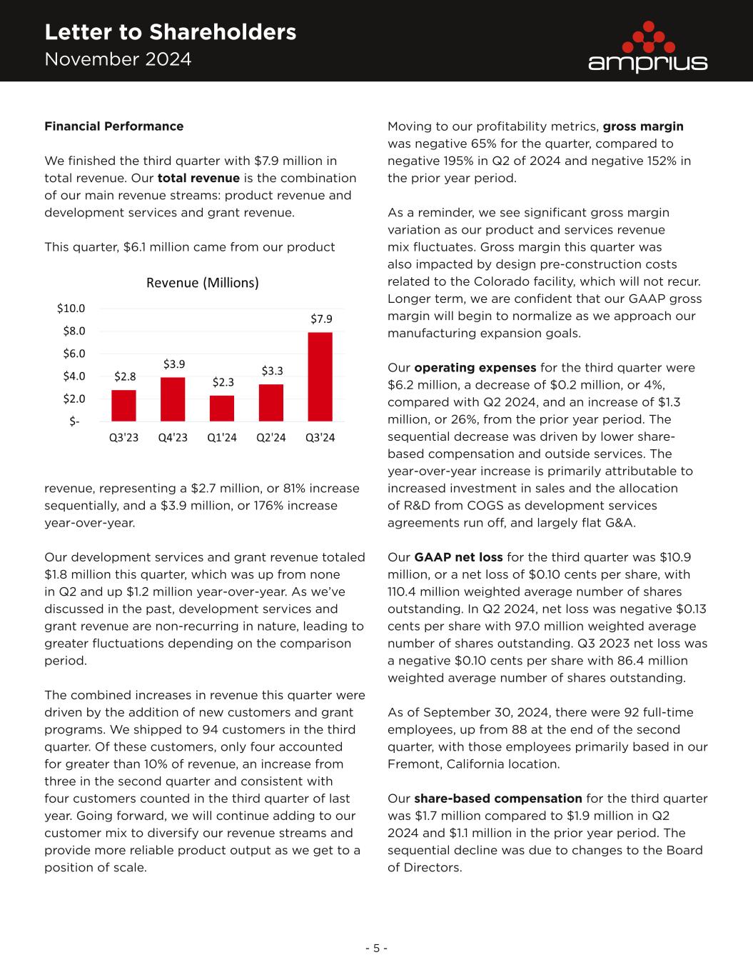 Letter to Shareholders November 2024 - 5 - Financial Performance We finished the third quarter with $7.9 million in total revenue. Our total revenue is the combination of our main revenue streams: product revenue and development services and grant revenue. This quarter, $6.1 million came from our product revenue, representing a $2.7 million, or 81% increase sequentially, and a $3.9 million, or 176% increase year-over-year. Our development services and grant revenue totaled $1.8 million this quarter, which was up from none in Q2 and up $1.2 million year-over-year. As we’ve discussed in the past, development services and grant revenue are non-recurring in nature, leading to greater fluctuations depending on the comparison period. The combined increases in revenue this quarter were driven by the addition of new customers and grant programs. We shipped to 94 customers in the third quarter. Of these customers, only four accounted for greater than 10% of revenue, an increase from three in the second quarter and consistent with four customers counted in the third quarter of last year. Going forward, we will continue adding to our customer mix to diversify our revenue streams and provide more reliable product output as we get to a position of scale. Moving to our profitability metrics, gross margin was negative 65% for the quarter, compared to negative 195% in Q2 of 2024 and negative 152% in the prior year period. As a reminder, we see significant gross margin variation as our product and services revenue mix fluctuates. Gross margin this quarter was also impacted by design pre-construction costs related to the Colorado facility, which will not recur. Longer term, we are confident that our GAAP gross margin will begin to normalize as we approach our manufacturing expansion goals. Our operating expenses for the third quarter were $6.2 million, a decrease of $0.2 million, or 4%, compared with Q2 2024, and an increase of $1.3 million, or 26%, from the prior year period. The sequential decrease was driven by lower share- based compensation and outside services. The year-over-year increase is primarily attributable to increased investment in sales and the allocation of R&D from COGS as development services agreements run off, and largely flat G&A. Our GAAP net loss for the third quarter was $10.9 million, or a net loss of $0.10 cents per share, with 110.4 million weighted average number of shares outstanding. In Q2 2024, net loss was negative $0.13 cents per share with 97.0 million weighted average number of shares outstanding. Q3 2023 net loss was a negative $0.10 cents per share with 86.4 million weighted average number of shares outstanding. As of September 30, 2024, there were 92 full-time employees, up from 88 at the end of the second quarter, with those employees primarily based in our Fremont, California location. Our share-based compensation for the third quarter was $1.7 million compared to $1.9 million in Q2 2024 and $1.1 million in the prior year period. The sequential decline was due to changes to the Board of Directors.
