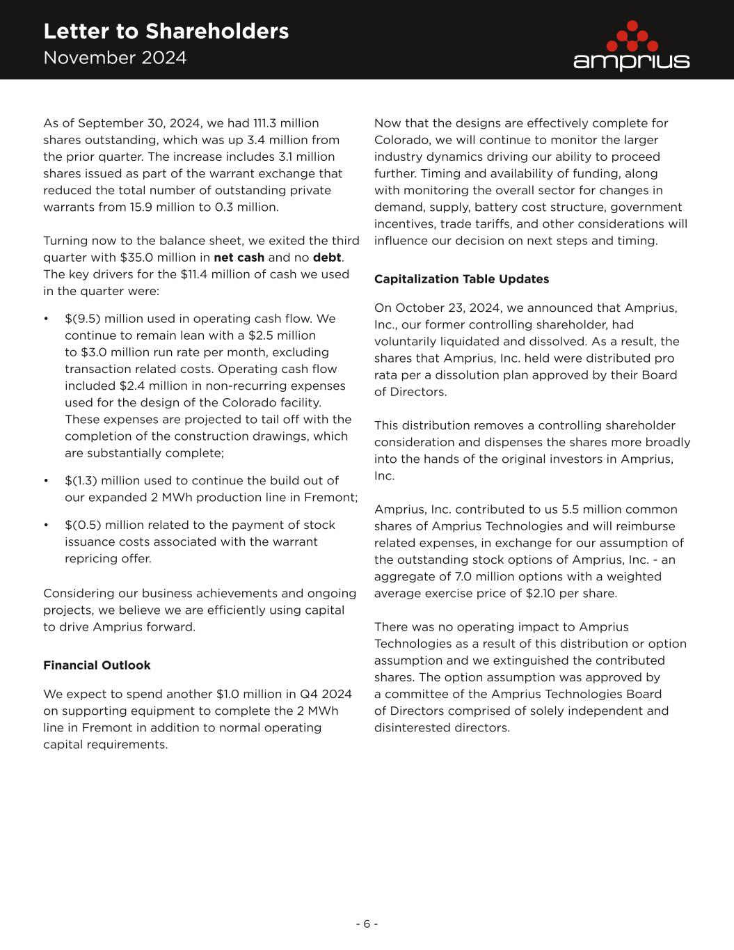 Letter to Shareholders November 2024 - 6 - As of September 30, 2024, we had 111.3 million shares outstanding, which was up 3.4 million from the prior quarter. The increase includes 3.1 million shares issued as part of the warrant exchange that reduced the total number of outstanding private warrants from 15.9 million to 0.3 million. Turning now to the balance sheet, we exited the third quarter with $35.0 million in net cash and no debt. The key drivers for the $11.4 million of cash we used in the quarter were: • $(9.5) million used in operating cash flow. We continue to remain lean with a $2.5 million to $3.0 million run rate per month, excluding transaction related costs. Operating cash flow included $2.4 million in non-recurring expenses used for the design of the Colorado facility. These expenses are projected to tail off with the completion of the construction drawings, which are substantially complete; • $(1.3) million used to continue the build out of our expanded 2 MWh production line in Fremont; • $(0.5) million related to the payment of stock issuance costs associated with the warrant repricing offer. Considering our business achievements and ongoing projects, we believe we are efficiently using capital to drive Amprius forward. Financial Outlook We expect to spend another $1.0 million in Q4 2024 on supporting equipment to complete the 2 MWh line in Fremont in addition to normal operating capital requirements. Now that the designs are effectively complete for Colorado, we will continue to monitor the larger industry dynamics driving our ability to proceed further. Timing and availability of funding, along with monitoring the overall sector for changes in demand, supply, battery cost structure, government incentives, trade tariffs, and other considerations will influence our decision on next steps and timing. Capitalization Table Updates On October 23, 2024, we announced that Amprius, Inc., our former controlling shareholder, had voluntarily liquidated and dissolved. As a result, the shares that Amprius, Inc. held were distributed pro rata per a dissolution plan approved by their Board of Directors. This distribution removes a controlling shareholder consideration and dispenses the shares more broadly into the hands of the original investors in Amprius, Inc. Amprius, Inc. contributed to us 5.5 million common shares of Amprius Technologies and will reimburse related expenses, in exchange for our assumption of the outstanding stock options of Amprius, Inc. - an aggregate of 7.0 million options with a weighted average exercise price of $2.10 per share. There was no operating impact to Amprius Technologies as a result of this distribution or option assumption and we extinguished the contributed shares. The option assumption was approved by a committee of the Amprius Technologies Board of Directors comprised of solely independent and disinterested directors.