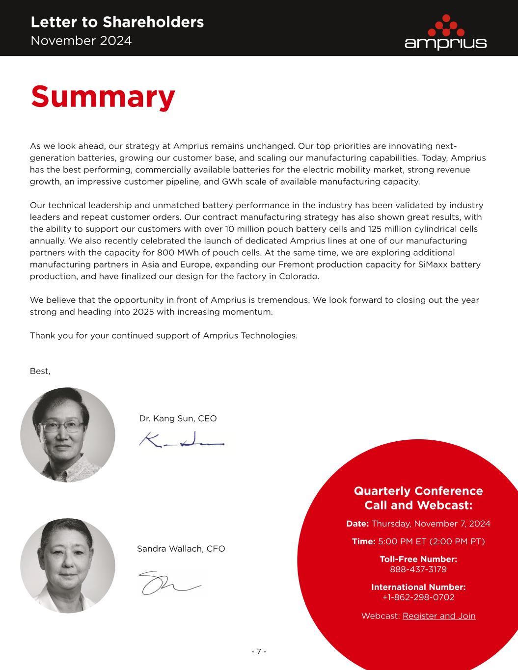 Letter to Shareholders November 2024 - 7 - Summary As we look ahead, our strategy at Amprius remains unchanged. Our top priorities are innovating next- generation batteries, growing our customer base, and scaling our manufacturing capabilities. Today, Amprius has the best performing, commercially available batteries for the electric mobility market, strong revenue growth, an impressive customer pipeline, and GWh scale of available manufacturing capacity. Our technical leadership and unmatched battery performance in the industry has been validated by industry leaders and repeat customer orders. Our contract manufacturing strategy has also shown great results, with the ability to support our customers with over 10 million pouch battery cells and 125 million cylindrical cells annually. We also recently celebrated the launch of dedicated Amprius lines at one of our manufacturing partners with the capacity for 800 MWh of pouch cells. At the same time, we are exploring additional manufacturing partners in Asia and Europe, expanding our Fremont production capacity for SiMaxx battery production, and have finalized our design for the factory in Colorado. We believe that the opportunity in front of Amprius is tremendous. We look forward to closing out the year strong and heading into 2025 with increasing momentum. Thank you for your continued support of Amprius Technologies. Best, Quarterly Conference Call and Webcast: Date: Thursday, November 7, 2024 Time: 5:00 PM ET (2:00 PM PT) Toll-Free Number: 888-437-3179 International Number: +1-862-298-0702 Webcast: Register and Join Dr. Kang Sun, CEO Sandra Wallach, CFO