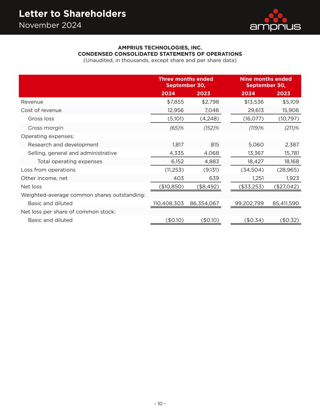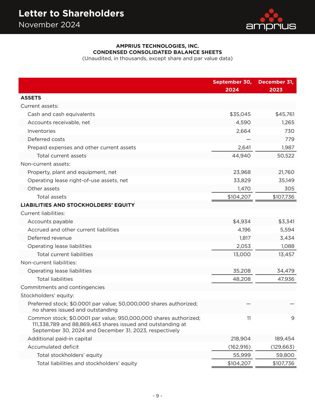 Letter to Shareholders November 2024 - 9 - AMPRIUS TECHNOLOGIES, INC. CONDENSED CONSOLIDATED BALANCE SHEETS (Unaudited, in thousands, except share and par value data) September 30, December 31, 2024 2023 ASSETS Current assets: Cash and cash equivalents $35,045 $45,761 Accounts receivable, net 4,590 1,265 Inventories 2,664 730 Deferred costs — 779 Prepaid expenses and other current assets 2,641 1,987 Total current assets 44,940 50,522 Non-current assets: Property, plant and equipment, net 23,968 21,760 Operating lease right-of-use assets, net 33,829 35,149 Other assets 1,470 305 Total assets $104,207 $107,736 LIABILITIES AND STOCKHOLDERS’ EQUITY Current liabilities: Accounts payable $4,934 $3,341 Accrued and other current liabilities 4,196 5,594 Deferred revenue 1,817 3,434 Operating lease liabilities 2,053 1,088 Total current liabilities 13,000 13,457 Non-current liabilities: Operating lease liabilities 35,208 34,479 Total liabilities 48,208 47,936 Commitments and contingencies Stockholders’ equity: Preferred stock; $0.0001 par value; 50,000,000 shares authorized; no shares issued and outstanding — — Common stock; $0.0001 par value; 950,000,000 shares authorized; 111,338,789 and 88,869,463 shares issued and outstanding at September 30, 2024 and December 31, 2023, respectively 11 9 Additional paid-in capital 218,904 189,454 Accumulated deficit (162,916) (129,663) Total stockholders’ equity 55,999 59,800 Total liabilities and stockholders’ equity $104,207 $107,736
